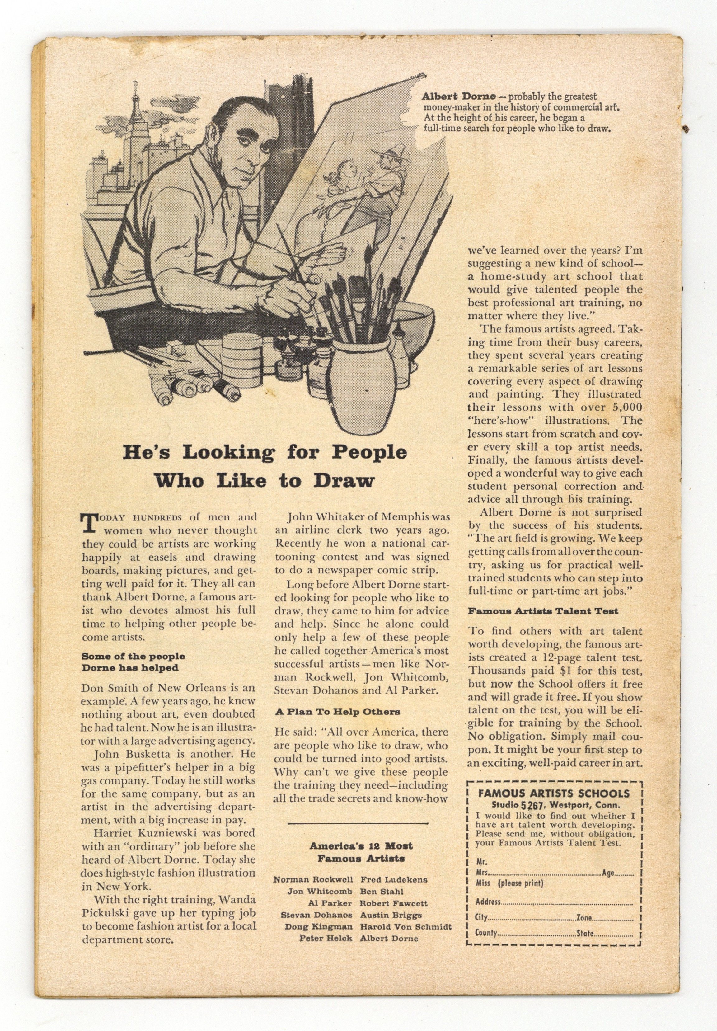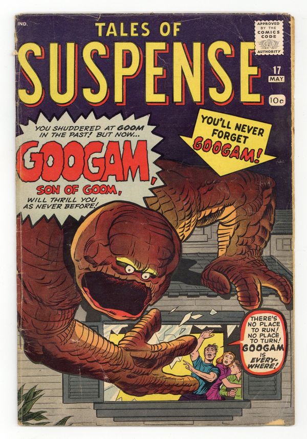 Cover pencils by Jack Kirby, inks by Dick Ayers. "Beware of Googam, Son of Goom!!", pencils by Jack Kirby, inks by Dick Ayers; Goom leaves an offspring in a cave to complete his conquest, and he comes across the family of the scientist who was responsible for his father's defeat; Googam is defeated when the scientist's son challenges him to a game of tag and runs off towards a pool of quicksand and then climbs a tree; When Googam sees the quicksand he mistakenly assumes that it is only mud since the boy must have run across it; Googam only sees the boy hiding in the tree as he sinks into the quicksand. "The Bridge" text story. "There Is Something Strange about Mister Jones!", art by Don Heck; A thug hears a man say that he has a fortune in his locker. He attacks him and tries to make him lead him there. His victim is Davy Jones, and he shows the thief his locker by drowning him. "What Lurks in the Mountain?", art by Steve Ditko; A communist general demands that the lama tell him of the alien space ship that has landed for repairs; At first the lama refuses to allow the aliens to be conquered by the communists, but he relents after the general threatens to execute all the peasants. 36 pgs., full color. $0.10. Cover price $0.10.