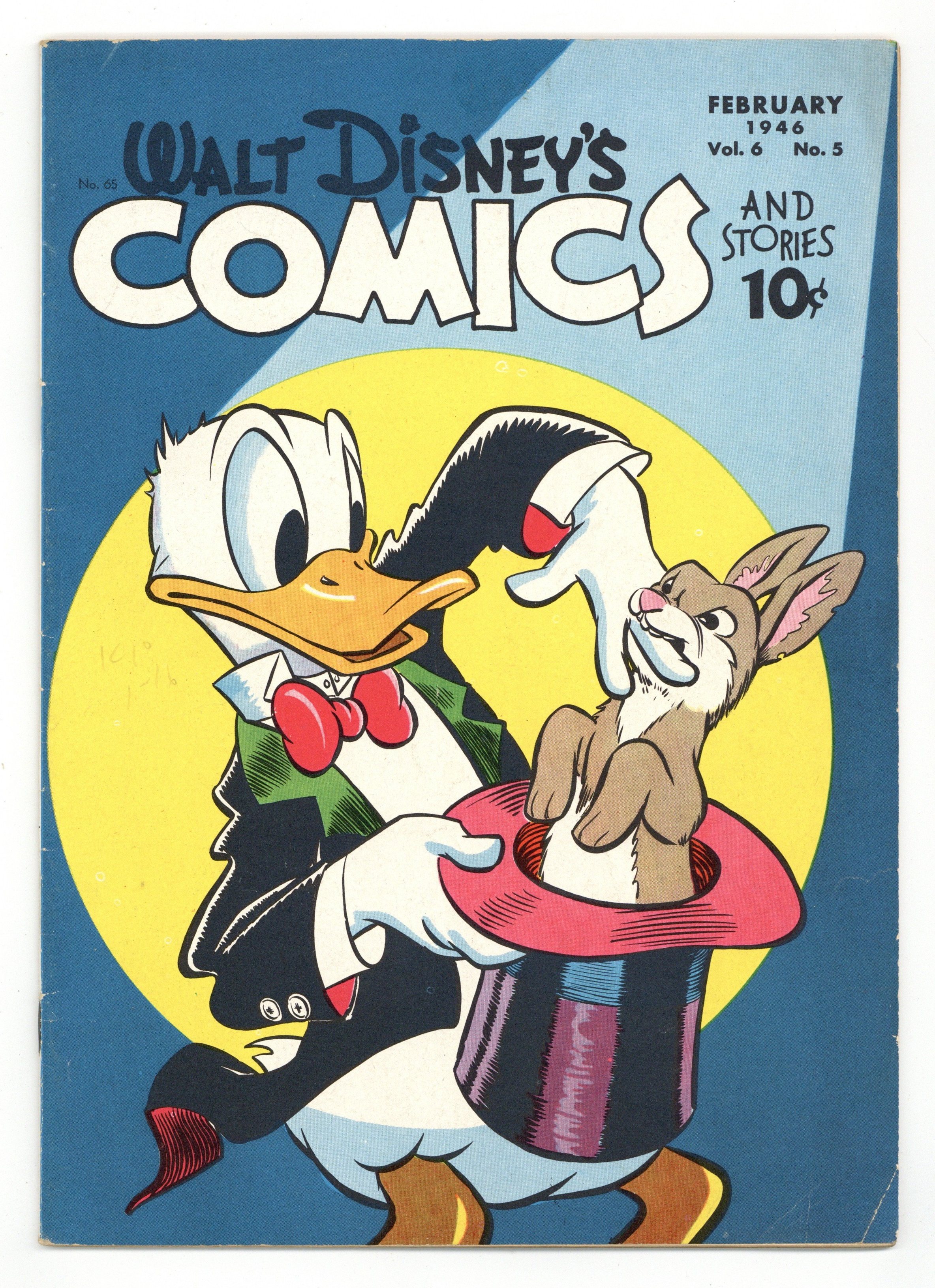 Tags: Disney Ducks & MicePublished Feb 1946 by Dell/Gold Key.$39.50- Lateral spine tear. Water spotting. Staple rust with migration.