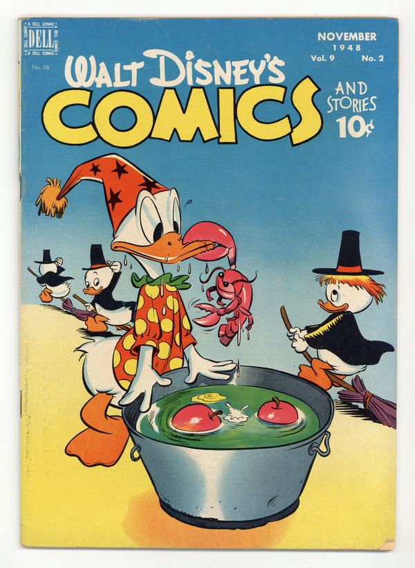 Tags: Disney Ducks & MicePublished Nov 1948 by Dell/Gold Key.$48.50Cover by Walt Kelly. Stories and art by Carl Barks, Floyd Gottfredson, Bill Walsh, Dick Moores, Bob Karp, Ralph Heimdahl, Harvey Eisenberg, Don Gunn, George Waiss, Bill Wright, and Al Taliaferro. Sometimes listed as Vol. 9 #2. The long-running vehicle for Disney character comics featured work by Carl Barks, Floyd Gottfredson, and Pogo's Walt Kelly. In a classic story from the Mickey Mouse comic strip, Mickey gets amnesia and thinks he's a gangster! In a story by Barks, Donald goes hunting to prove his sportsmanship to Uncle Scrooge. This story features the first appearance of Uncle Scrooge in Walt Disney's Comics and Stories. Donald has to break into his own house - but it's the wrong house. Donald Duck; Bucky Bug; Li'l Bad Wolf; Mickey Mouse; Chip N Dale: Winter Storage; Plutos Sweater; Halloween Holdup; Mickey Mouse: Gangland. 48 pages, Full Color. Cover price $0.10.