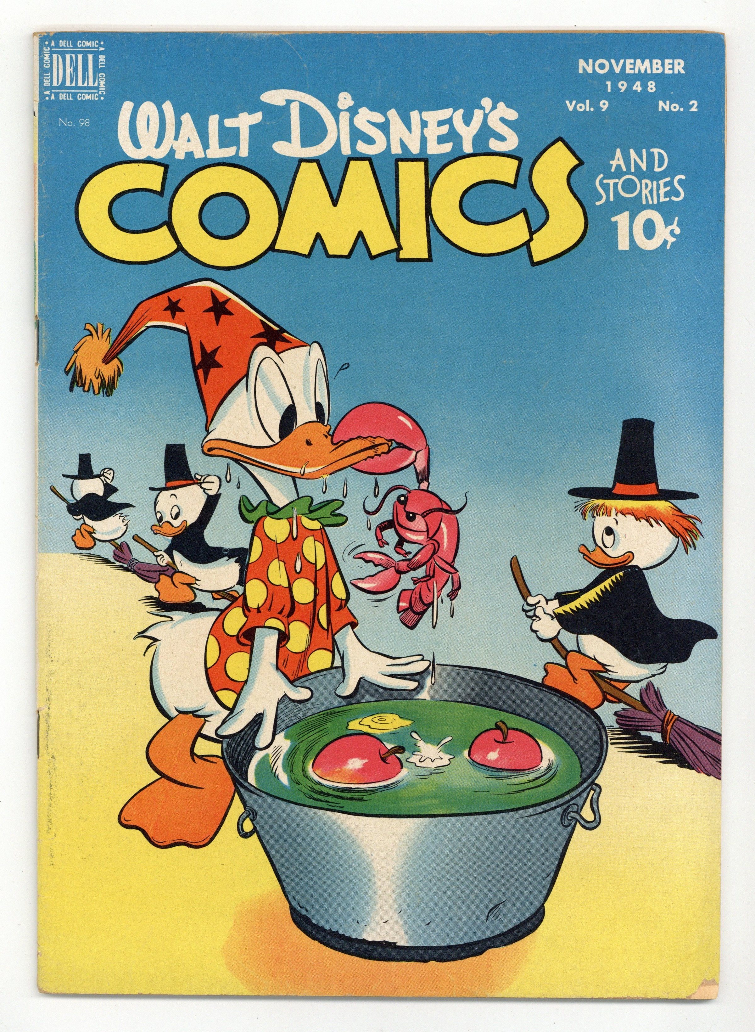 Cover by Walt Kelly. Stories and art by Carl Barks, Floyd Gottfredson, Bill Walsh, Dick Moores, Bob Karp, Ralph Heimdahl, Harvey Eisenberg, Don Gunn, George Waiss, Bill Wright, and Al Taliaferro. Sometimes listed as Vol. 9 #2. The long-running vehicle for Disney character comics featured work by Carl Barks, Floyd Gottfredson, and Pogo's Walt Kelly. In a classic story from the Mickey Mouse comic strip, Mickey gets amnesia and thinks he's a gangster! In a story by Barks, Donald goes hunting to prove his sportsmanship to Uncle Scrooge. This story features the first appearance of Uncle Scrooge in Walt Disney's Comics and Stories. Donald has to break into his own house - but it's the wrong house. Donald Duck; Bucky Bug; Li'l Bad Wolf; Mickey Mouse; Chip N Dale: Winter Storage; Plutos Sweater; Halloween Holdup; Mickey Mouse: Gangland. 48 pages, Full Color. Cover price $0.10.