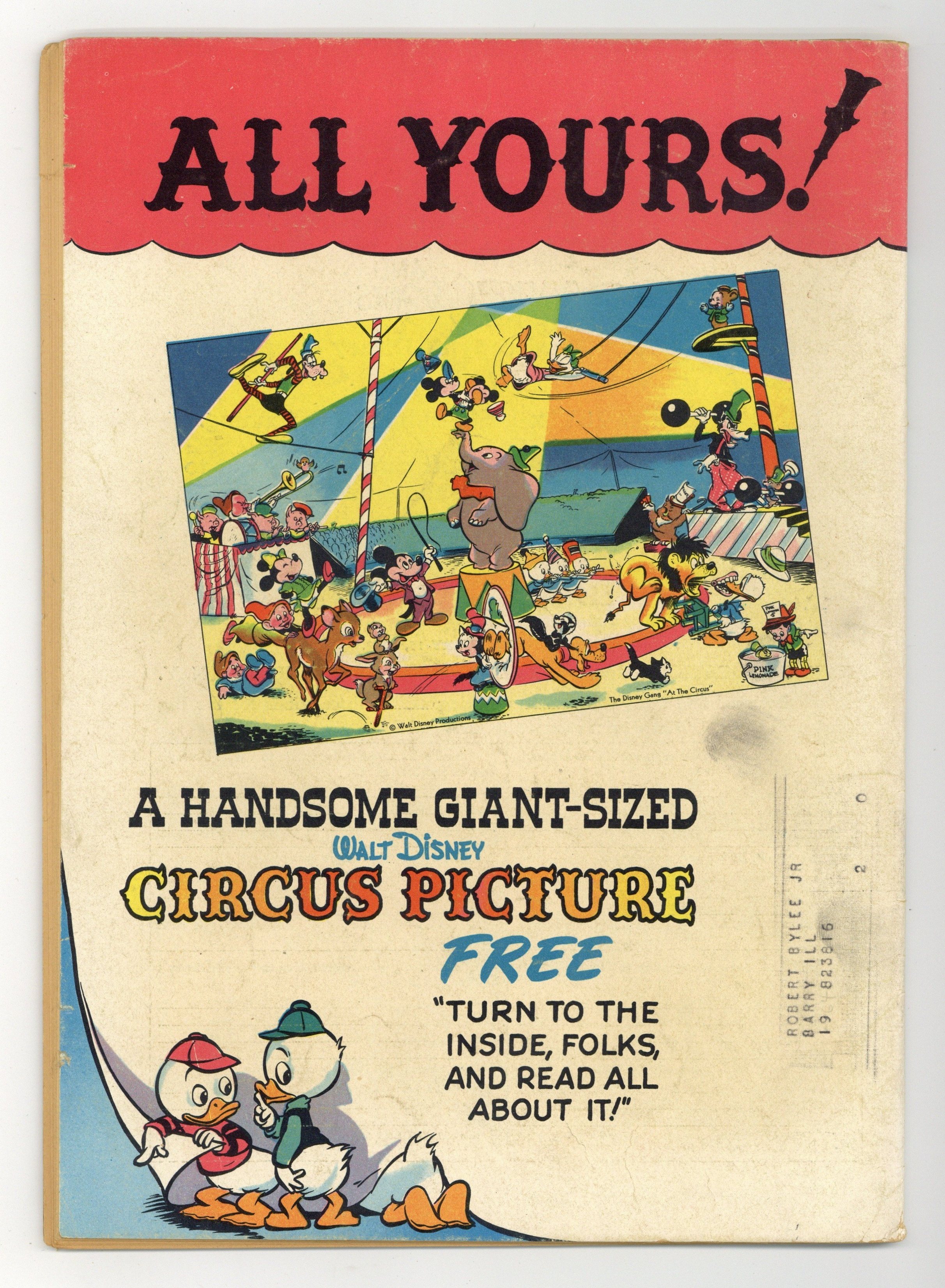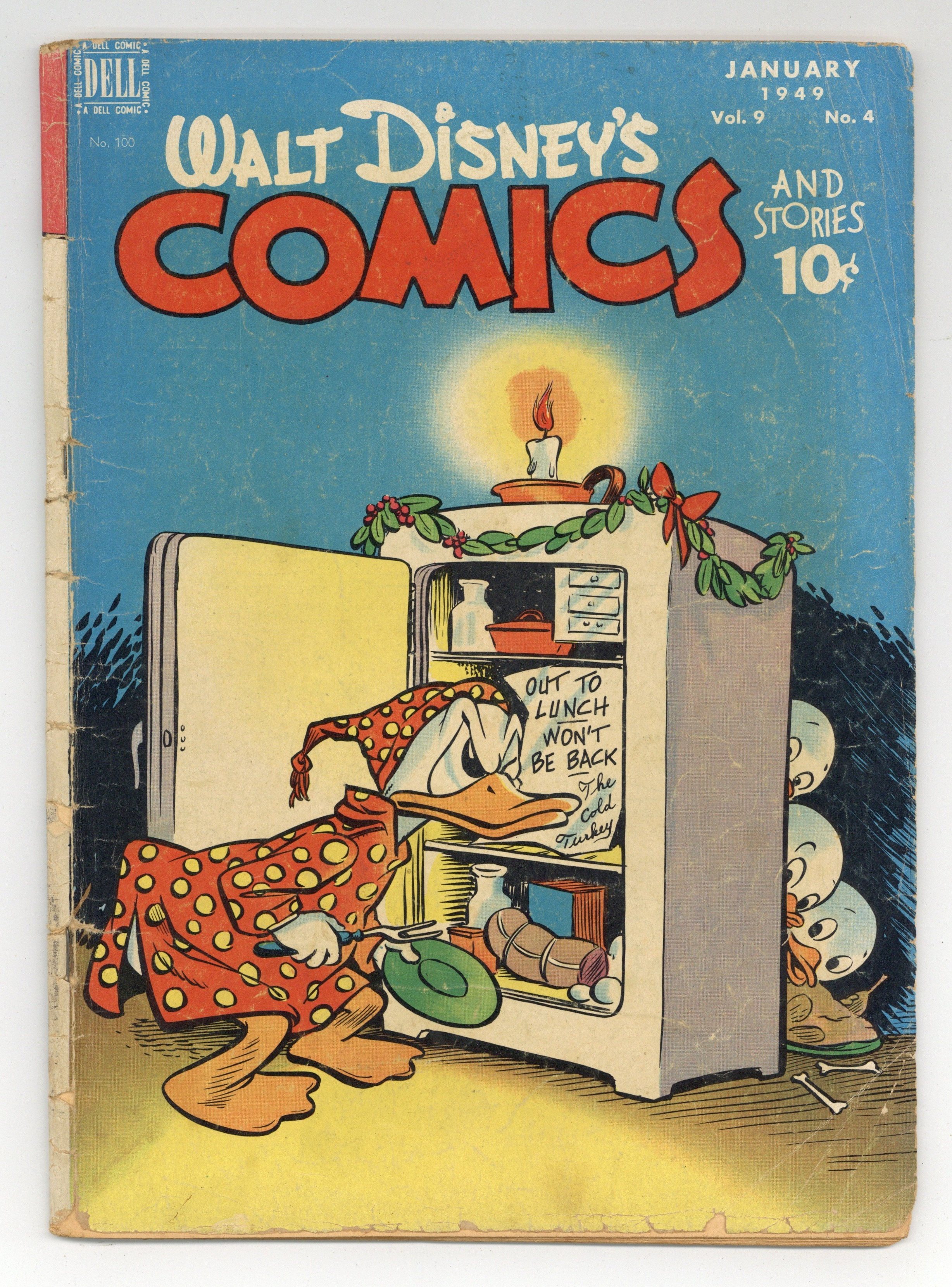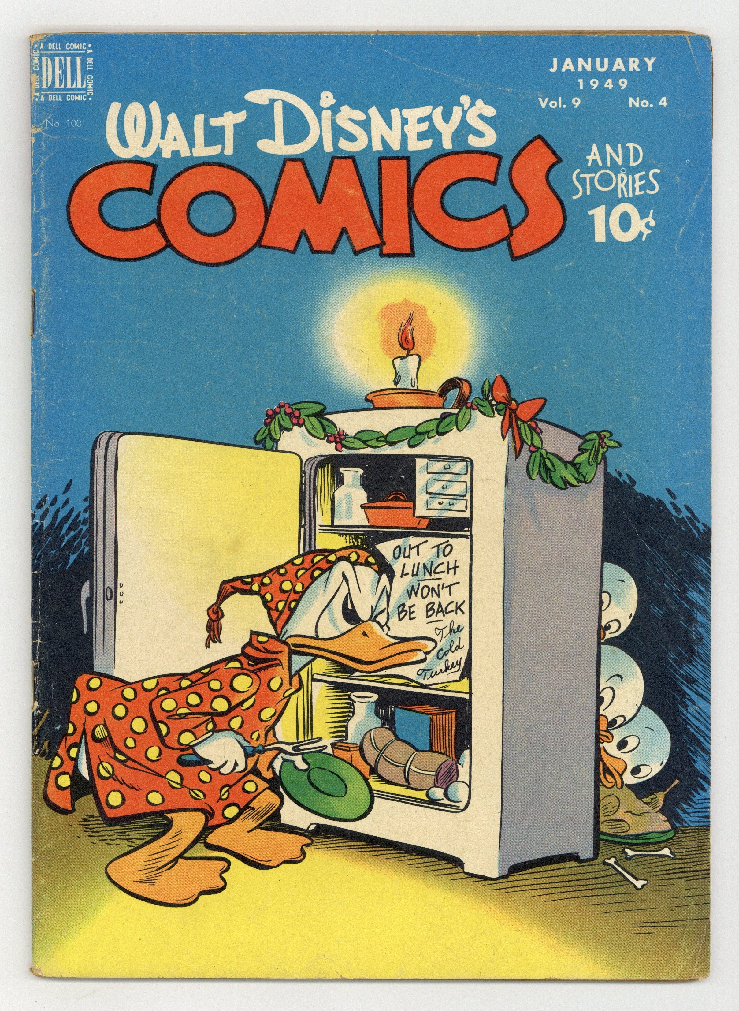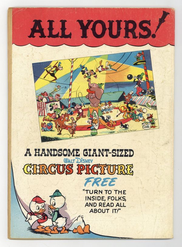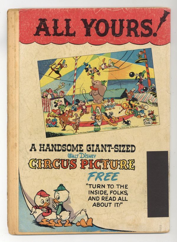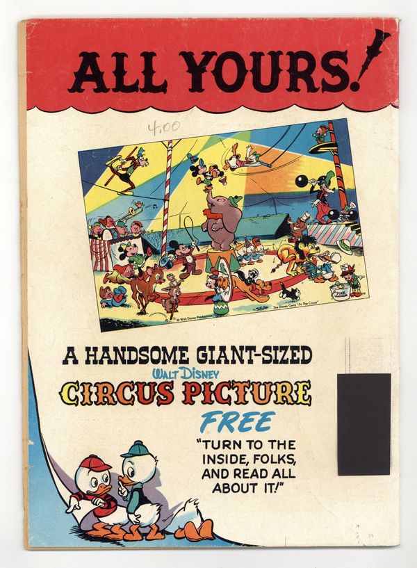 Cover by Walt Kelly. Stories and art by Carl Barks, Floyd Gottfredson, Bill Walsh, Dick Moores, Bob Karp, Hubie Karp, Tony Strobl, Gil Turner, George Waiss, Bill Wright, and Al Taliaferro. Sometimes listed as Vol. 9 #4. The long-running vehicle for Disney character comics featured work by Carl Barks, Floyd Gottfredson, and Pogo's Walt Kelly. In a classic story from the Mickey Mouse comic strip, Pluto is befuddled by a talking dog (who's not Goofy). In a story by Barks, Huey, Dewey and Louie try to elude a truant officer who looks strangely familiar. This story is adapted from the Disney cartoon Truant Officer Donald, which Carl Barks also wrote. Plus a vintage ad for a Walt Kelly-drawn, circus-themed poster featuring all the Disney characters. Donald Duck; Bucky Bug; Li'l Bad Wolf; Mickey Mouse; Santa's Secret; Mickey Mouse: The Talking Dog. 48 pages, Full Color. Cover price $0.10.