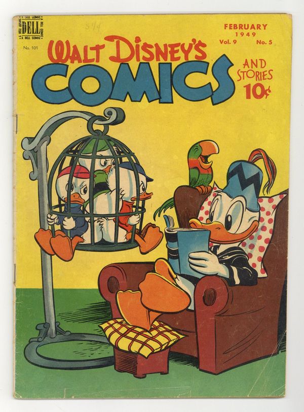Cover by Walt Kelly. Stories and art by Carl Barks, Floyd Gottfredson, Bill Walsh, Dick Moores, Merrill De Maris, Bob Karp, Gil Turner, George Waiss, Bill Wright, Manuel Gonzales, and Al Taliaferro. Sometimes listed as Vol. 9 #5. The long-running vehicle for Disney character comics featured work by Carl Barks, Floyd Gottfredson, and Pogo's Walt Kelly. In a classic story from the Mickey Mouse comic strip, Mickey investigates stolen cameras, and encounters the supervillain called the Phantom Blot! This is the first appearance of the Phantom Blot in Walt Disney's Comics and Stories. In a story by Barks, the doctor orders Donald to crochet to get over his recurrent nightmares. Li'l Bad Wolf is enlisted to baby-sit Filbert the Elephant. Donald Duck; Bucky Bug; Li'l Bad Wolf; Mickey Mouse; The Schemers; Mickey Mouse Outwits the Phantom Blot. 48 pages, Full Color. Cover price $0.10.