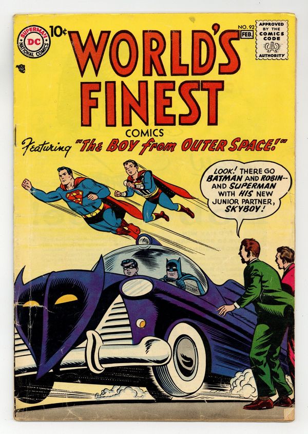 Cover pencils by Curt Swan, inks by Stan Kaye. The Boy From Outer Space! starring Superman and Batman, script by Edmond Hamilton, pencils by Dick Sprang, inks by Stan Kaye; A mysterious boy with Super-powers crash lands on Earth; Superman takes him in, but Batman suspects he's a criminal. Lem n' Lime humor two-pager by Henry Boltinoff. The Indian Cannoneers starring Tomahawk, art by Fred Ray. Varsity Vic humor page by Henry Boltinoff. World At Your Fingertips text article about stamp collecting. Marauders from the Deep starring Green Arrow, art by George Papp; Green Arrow has to fight crime under water. Wanted: A Teen-Age Code public service announcement, script by Jack Schiff, art by Ruben Moriera. 36 Pages, Full Color. Cover price $0.10.