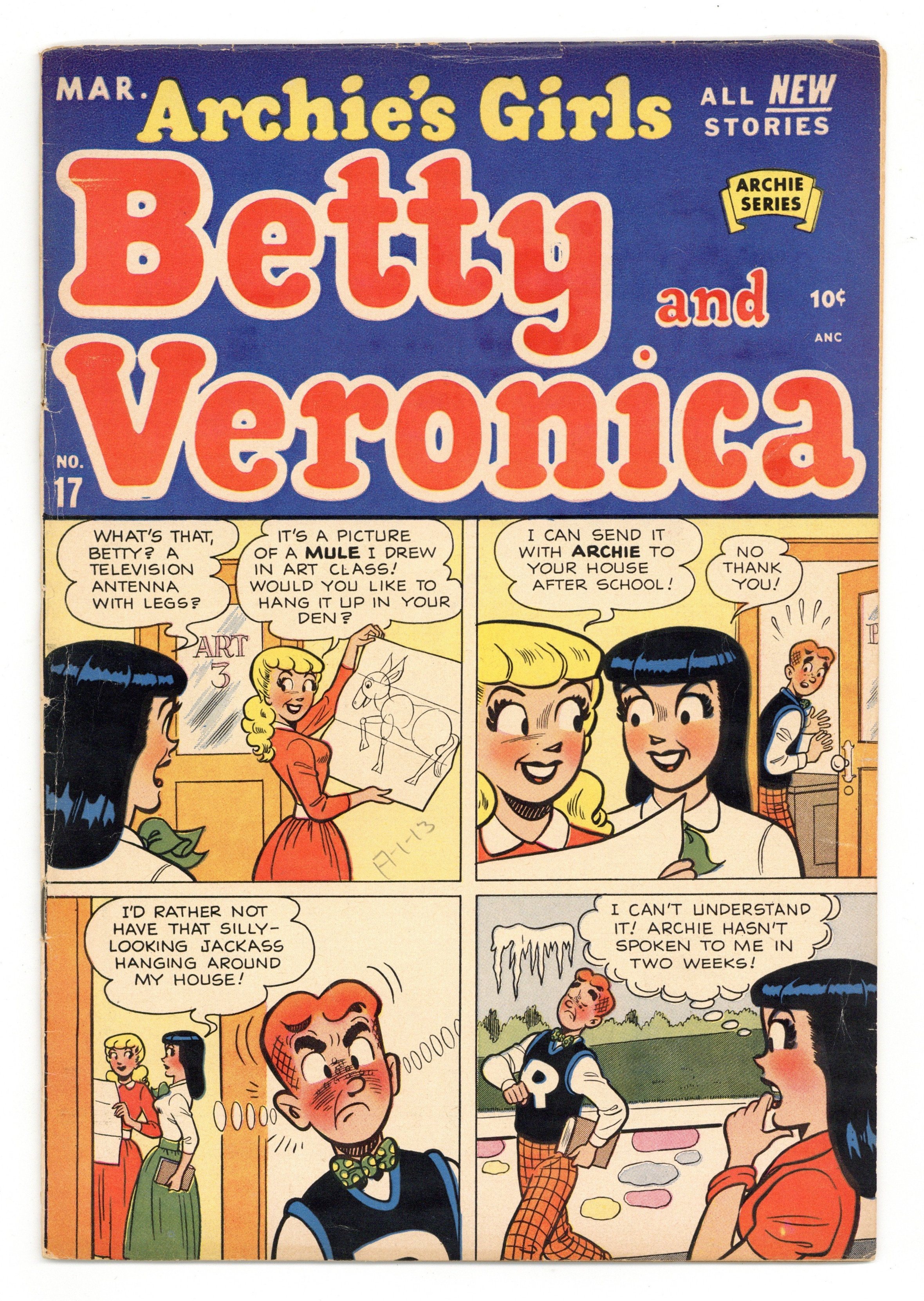 "Bigger and Bitter"; Betty is going to give Archie a professional photo of herself for his birthday; Veronica finds out and goes to the same photographer and has a much larger photo made of herself. "Snooty Cuties!"; Veronica invites Archie to a party she's hosting for some high-class girls. "Wiser Adviser"; Archie gets mad when Betty knows more than he does. "On the Other Foot"; Reggie reads that a shoe store has a case of shoes only for the right foot; Betty remembers that Jughead bought a grab bag box at an auction that only had left foot shoes. "Plots to You" text story. "The Hic Parade," art by Joe Edwards; Betty tries to cure Veronica of the hiccups. Archie Giant Series ad. "One of Those Daze"; No matter what Reggie says to Moose about Midge, he gets beaten up. 36 pgs., full color. $0.10. Cover price $0.10.