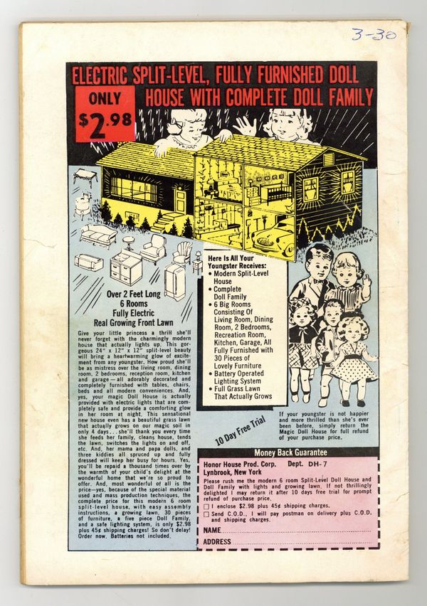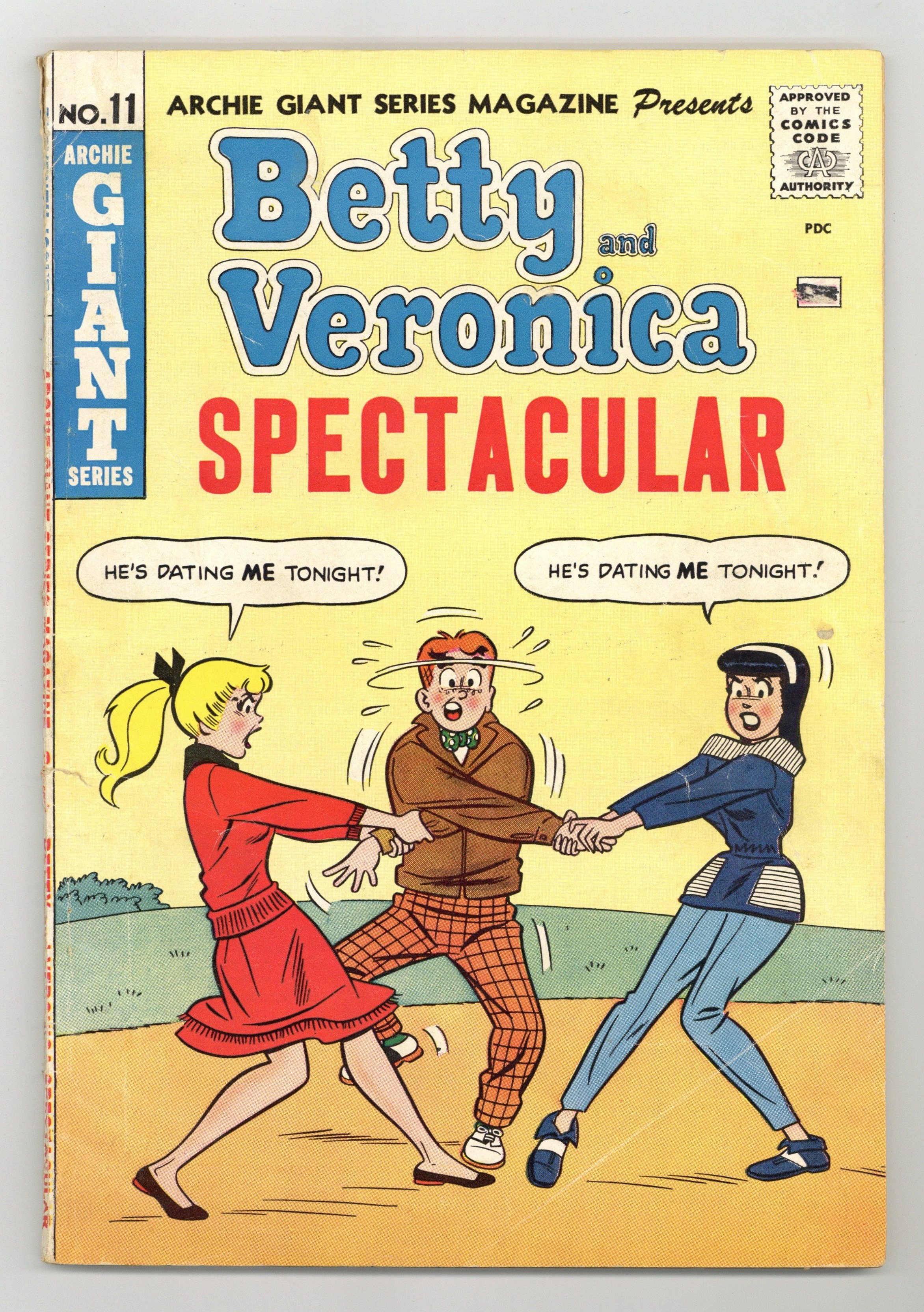 Betty & Veronica Spectacular. "The Shadows," pencils by Dan DeCarlo; Archie can't remember if he asked Betty or Veronica for a date, though both claimed he did; He flips a coin and Betty wins. Veronica stalks them all evening. "Call Me Mister," pencils by Dan DeCarlo; Veronica has a pet rabbit. When it gets loose, everyone keeps bringing Archie to Veronica, thinking he's the "cuddle bunny" she's missing. Betty's Pin-Up Page, pencils by Dan DeCarlo. "Believe It or Not," pencils by Dan DeCarlo; Archie and Jughead are annoyed by the girls' habit of answering a statement with a question like "It didn't!" "The Robot's Revolt," pencils by Dan DeCarlo; Veronica takes credit for molding Archie into the perfect boyfriend. Betty tells Veronica she's stifling Archie's personality; At the same time, Jughead is lecturing Archie on not agreeing to everything Veronica tells him. "Kitchen Crisis," script by Frank Doyle, pencils by Dan DeCarlo, inks by Rudy Lapick; Veronica decides she's going to bake muffins, which sends everyone into a panic. Betty's Pin-Up Page, pencils by Dan DeCarlo. Archie's Pals 'n' Gals ad. 84 pgs., full color. Cover price $0.25.