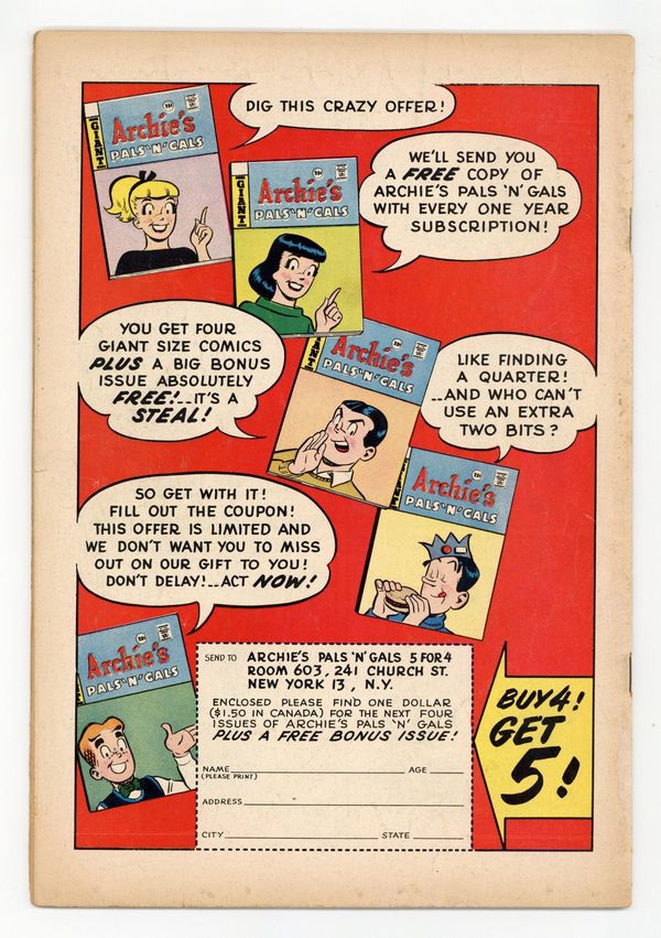 Cover by Samm Schwartz. "Space Guys 'n' Gals," art by Joe Edwards; Lester borrows the Pink Martian's flying saucer and he returns with a summary of teen-age habits in outer space. "The Law of Attraction," art by Joe Edwards; Two girls from Pluto come to Earth to check out the boys. "Witch Pitch," script by George Gladi, pencils by Dan DeCarlo; Della assigns Sabrina to put a hex on her school's hockey team. "Monsters in the News," art by Joe Edwards; Gossip about Hollywood monsters. "The Time of Your Life Machine," pencils by Dan DeCarlo; Les and Ches go back to 562 A.D. to learn how King Arthur and his knights really lived. Ads for Archie Giant Series Magazines, Archie's Pals 'n' Gals. 36 pgs., full color. $0.12. Cover price $0.12.