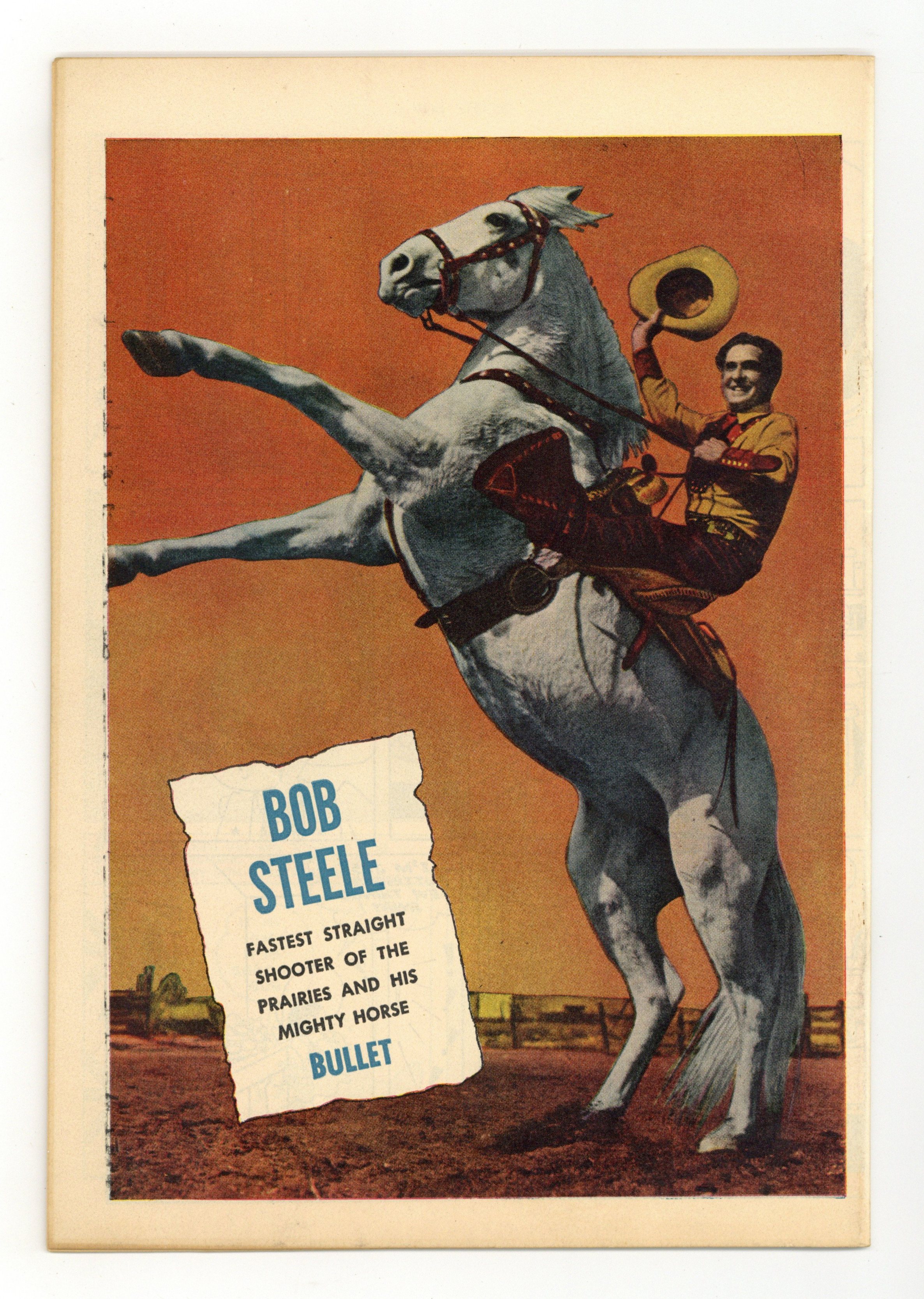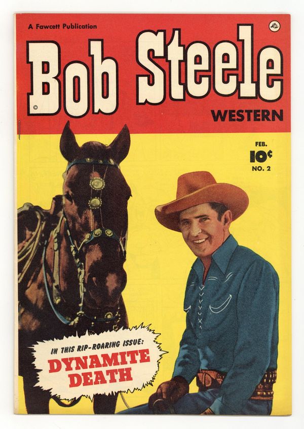 Stories and art by Al Zere and others. TV and movie cowboy Bob Steele rides the range in the Old West, part of Fawcett's lineup of comics based on classic Western stars. In a three-part story, Bob is hired to lead a wagon train full of supplies to oil fields south of the border. But a ruthless killer and his desperados are determined to raid the party. It all leads to a battle over an oil derrick with guns and dynamite. Glib Gibbons; Dynamite Death, Chapter 1: Poisonous Fangs; Chief Gray Matter; Fizzy: The New Job; Chapter 2: Stampeding Terror; Bugle Call for Courage; Dimwit Diddle; Chapter 3: Six-Gun Explosion; Bronko Betsy. 36 pages, Full Color. Cover price $0.10.