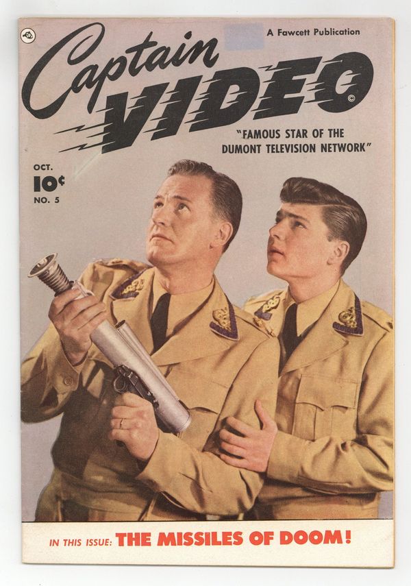 Stories and art by George Evans and Martin Thall. Early TV superhero Captain Video comes to comics, an electronics wizard from an era when technology was just starting to change the world. Landing on The Dark Side of the Moon, Captain Video learns that the lunar sphere is infested with aliens who are using it as a staging ground for an invasion of Earth. Western-movie hero Rod Cameron investigates mysterious killings and is targeted for death himself. Sinister Dr. Pauli uses sophisticated new guided-missile tech to hold the US Capitol hostage, unless Cap and Ranger can intervene. Art by future EC legend George Evans. Plus an anti-bigotry PSA, and a vintage ad listing the "Dumont Stations" where readers can watch Captain Video on TV. And photos of TV's Captain Video, Al Hodge, including a color photo on the back cover. The Dark Side of the Moon; Rod Cameron: Sudden Death; The Treasure of Asteroid K; Pilot Pete; The Missiles of Doom; Airfield Al. 32 pages, Full Color. Cover price $0.10.