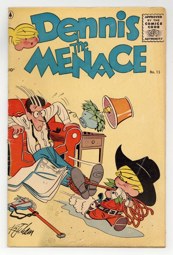 Cover art by Hank Ketcham. Reprints of daily Dennis the Menace cartoons by Ketcham. Dennis vs. Texas, script by Fred Toole, art by Al Wiseman. Track!, script by Fred Toole, art by Al Wiseman. Court of Honor text story. Ruff to the Rescue!, script by Fred Toole, art by Al Wiseman. Feel Like Doin' Some Coloring? activity page. Screamy Mimi, script by Fred Toole, art by Al Wiseman. Stage Struck, script by Fred Toole, art by Al Wiseman. 36 pgs. $0.10. Cover price $0.10.