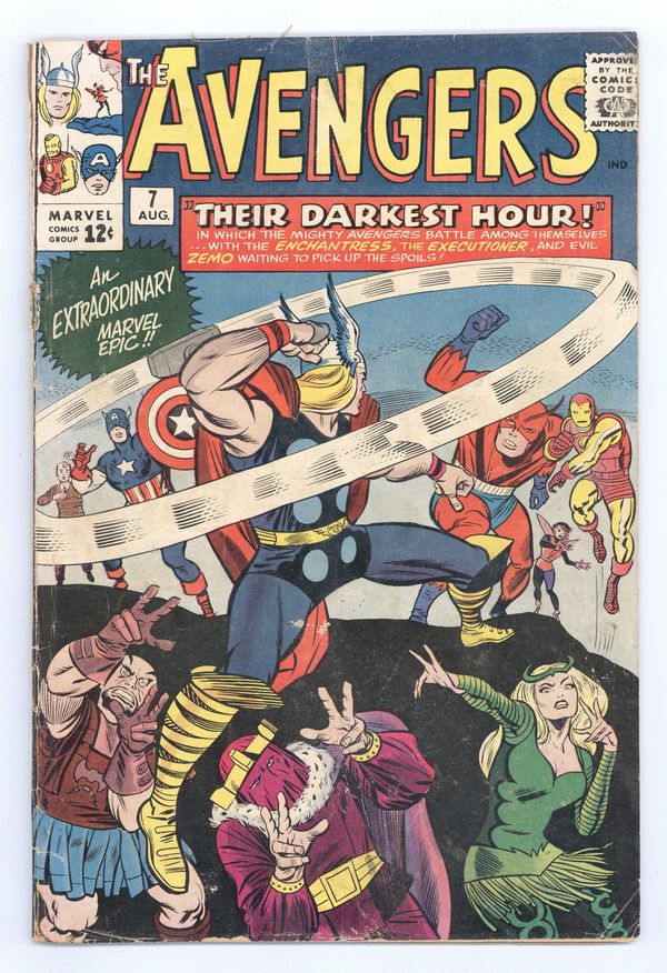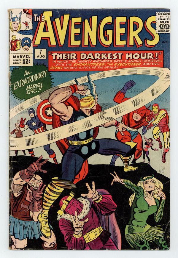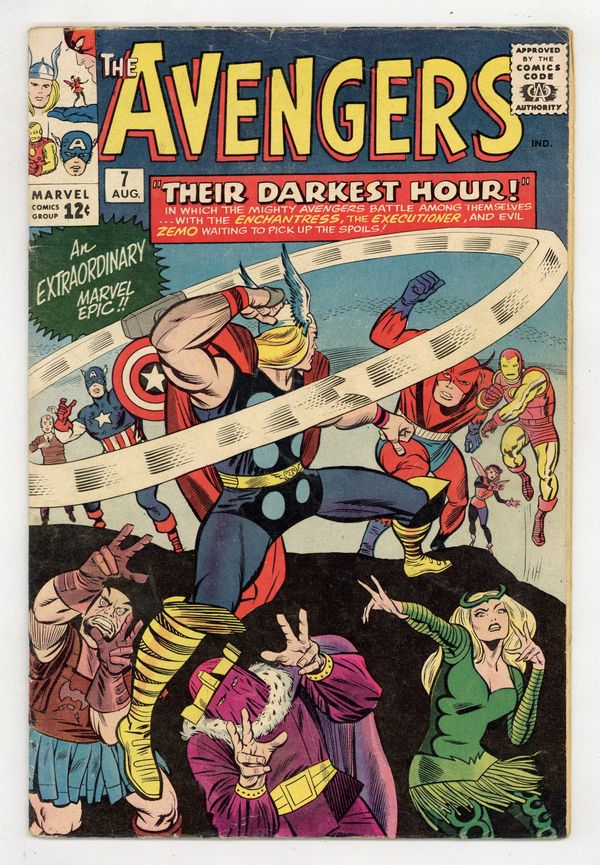 Tags: Marvel Legacy Numbering: Avengers (part 7), Avengers$100.00Cover pencils by Jack Kirby, inks by Chic Stone. Rick Jones dons Bucky's costume in "Their Darkest Hour!", script by Stan Lee, pencils by Jack Kirby, inks by Chic Stone; In Asgard, the Enchantress and the Executioner are banished to Earth by Odin; There they find Zemo (who had managed to escape the authorities) and they team up with him to stop Captain America; The Enchantress' motive is to get Thor by her side; She successfully lures Thor and hypnotizes him to fight for them; Meanwhile Captain America travels to the Amazon jungle to capture Zemo; Captain America then wins against Zemo's forces and Zemo tries to escape; Captain America grabs onto to the escape ship, however; The other Avengers fight Thor and, thanks to Iron Man, bring him back to his senses; Zemo's ship flies to the Avengers battle to rescue the Executioner and the Enchantress. Roster includes Thor, Iron Man, Giant-Man, Wasp, and Captain America. 36 pgs., full color. $0.12. Cover price $0.12.