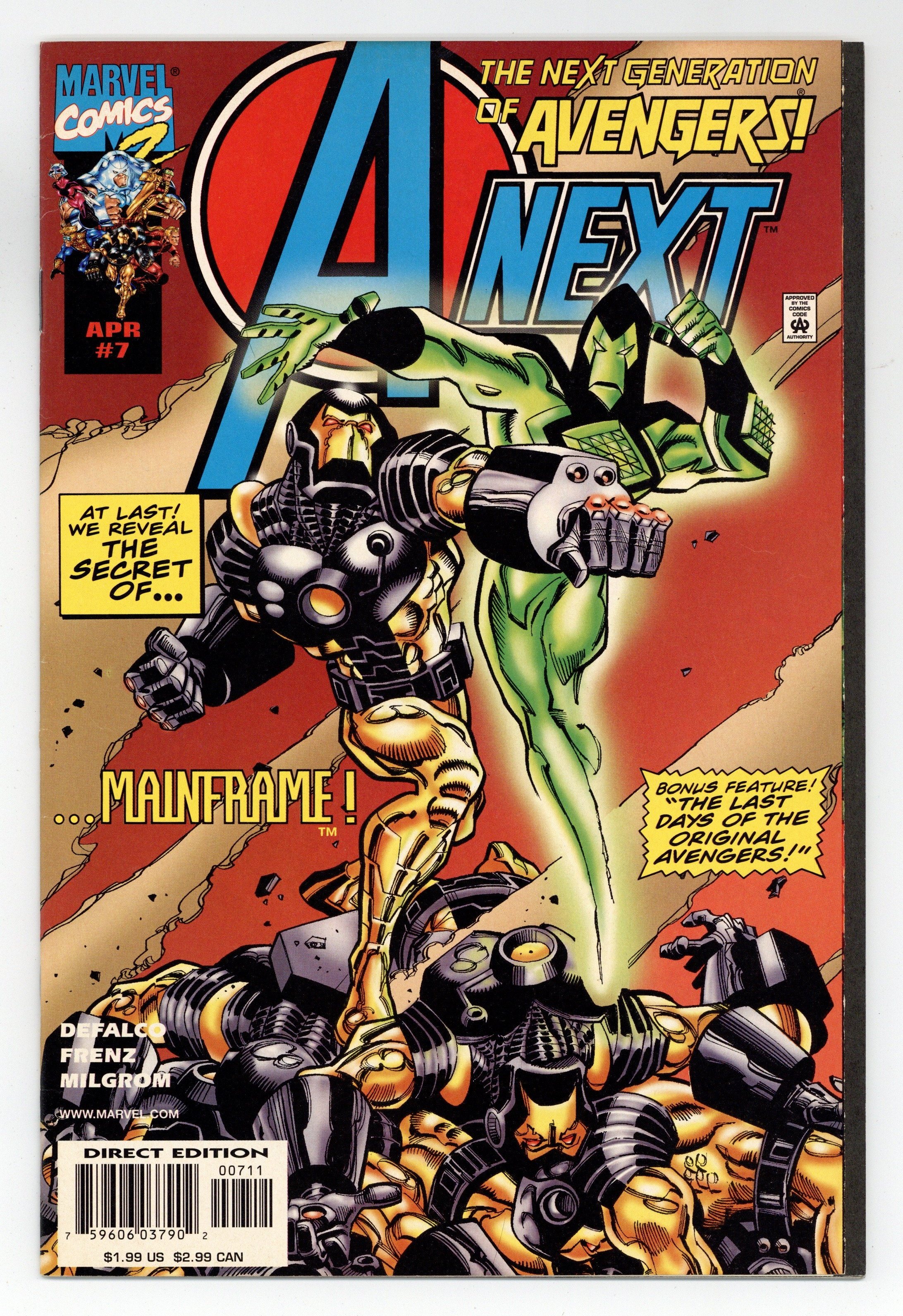 Written by Tom Defalco and Ron Frenz. Art by Ron Frenz and Al Milgrom. 1st appearance of Hope Pym, aka Red Queen (in shadows only). "After the Fall" part of the Origin of Mainframe; featuring J2, Stinger, Thunderstrike, Mainframe, American Dream, Freebooter, Bluestreak, The Crimson Curse, Scott Lang, Ion Man, Jarvis, Captain America, Vision, Iron Man, Giant Man, Tigra, Hawkeye, Scarlet Witch, Firestar, Justice, Wasp, Hercules. Includes "The Last Days of the Original Avengers. 38 pages. Cover price $1.99.