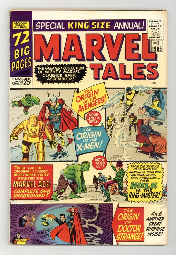 Reprints: X-Men 1, Avengers 1, Strange Tales 115 (Doctor Strange origin), and Hulk 3; Jack Kirby and 72-page giant. All reprints. "X-Men" (script by Stan Lee, pencils by Jack Kirby, inks by Paul Reinman from Uncanny X-Men 1); the Hulk stars in "The Ringmaster" (scripts by Lee, pencils by Kirby, inks by Dick Ayers from Hulk 3); "The Origin of Dr. Strange" (script by Lee, art by Steve Ditko from Strange Tales 115); "The Coming of the Avengers" (script by Lee, pencils by Kirby, inks by Ayers from Avengers 1); and a monster story, "A Monster Among Us" (script by Lee, art by Ditko from Amazing Adult Fantasy 8). Cover price $0.25.