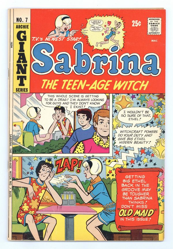 Cover pencils by Stan Goldberg, inks by Joe Sinnott. When You Witch Upon a Star! starring Sabrina, script and pencils by Al Hartley, inks by Joe Sinnott; Hilda tries to teach Sabrina to be an evil witch, but Sabrina feels that the power inside her comes from a higher place, and that her powers weren't meant to be used for evil. Old Maid starring Sabrina with the Archie Gang, script by Dick Malmgren, pencils by Stan Goldberg, inks by Joe Sinnott. A Taste of Pollution starring Sabrina and Archie, script by Dick Malmgren, pencils by Bill Vigoda. Barbecue Blast starring Sabrina, script and pencils by Al Hartley. 52 pgs. $0.25. Cover price $0.25.