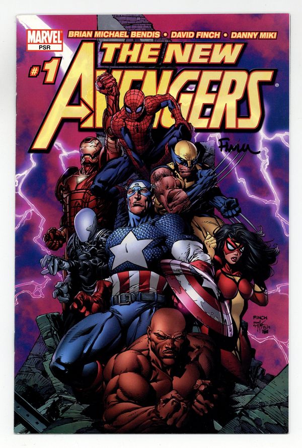 2nd Printing Finch Cover - Written by Brian Michael Bendis Pencils & cover by David Finch "NEW AVENGERS" PART 1 (OF 5). After the Devasting destruction of the orginal Avengers just what sort of threat to the world could persuade Captain America to assemble an all-new team? And after the events of AVENGERS DISASSEMBLED, who could possibly be on this team? How does Cap, Iron Man, Spider-Man & Wolverine sound? Get ready for the first of a proposed 500-issue run that signals an all-new era, as Bendis & Finch joins with you, the fervent faithful, for the launch of the all-new ongoing Avengers series! 32 PGS./ MARVEL PSR Cover price $2.25.
