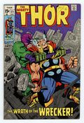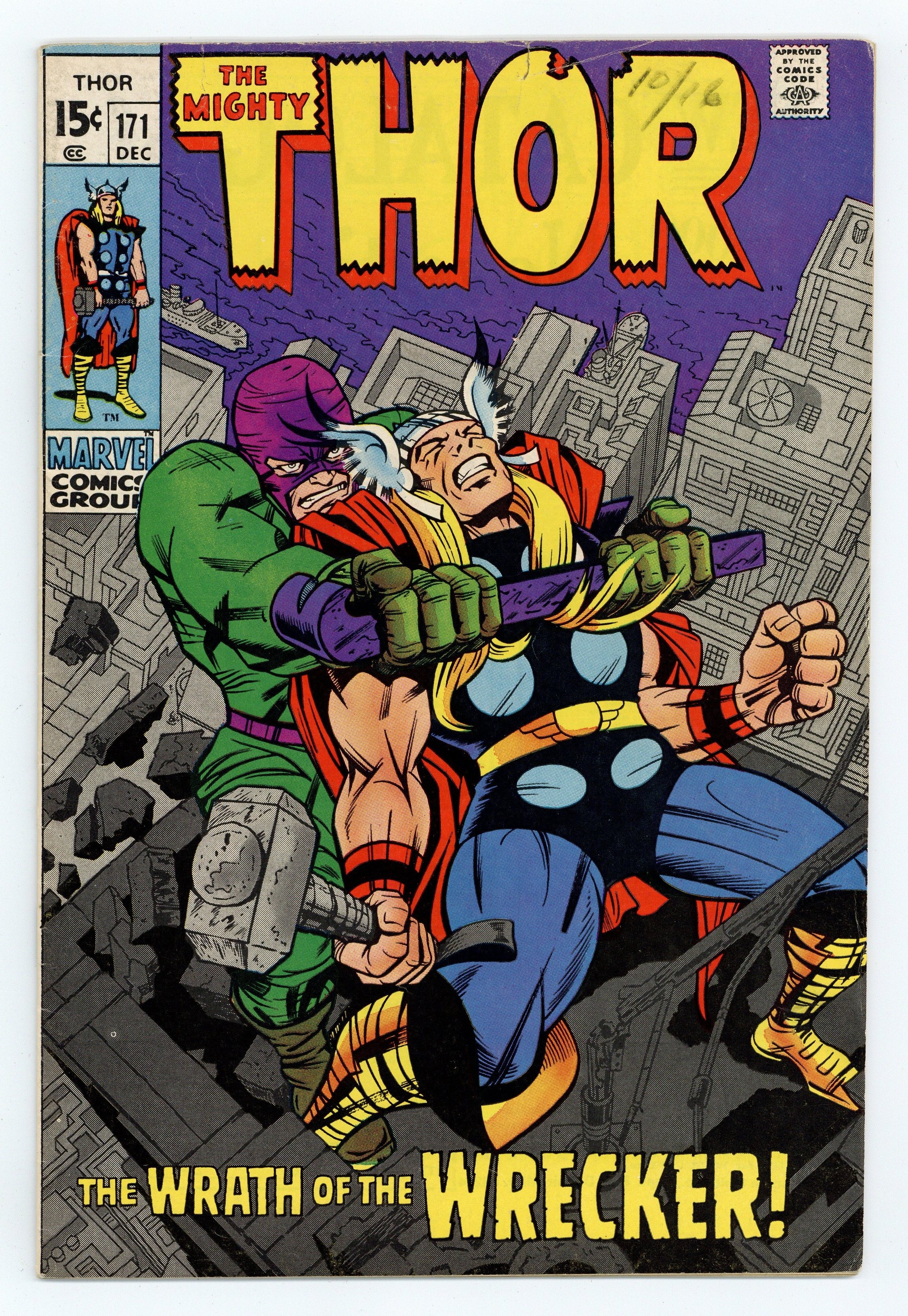 Tags: Marvel Legacy Numbering: Thor (part 171), Thor$21.50Cover pencils by Jack Kirby, inks by Bill Everett. "The Wrath of the Wrecker!", script by Stan Lee, pencils by Jack Kirby, inks by Bill Everett; After the shooting of civil rights activist Pedro Luis Lopez, Thor springs into action…as Donald Blake!; Will Dr. Blake be able to save Lopezs life before the city erupts into race riots?; The Destroyer makes a less than triumphant return, leaving Donald Blake/Thor with even more on his plate! Bullpen Bulletins. 36 pgs., full color. Cover price $0.15.