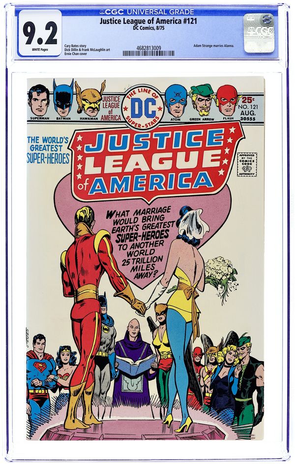 Cover art by Ernie Chan. The Hero Who Jinxed the Justice League!, script by Cary Bates, pencils by Dick Dillin, inks by Frank McLaughlin; Adam Strange marries his long-time sweetheart, Alanna; Kanjar Ro guest-stars. 32 pgs. $0.25. Cover price $0.25.
