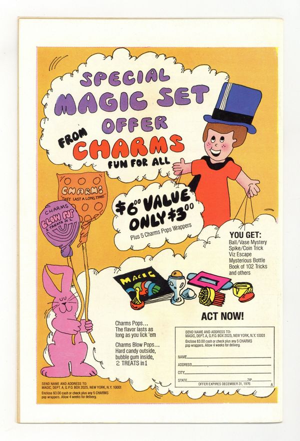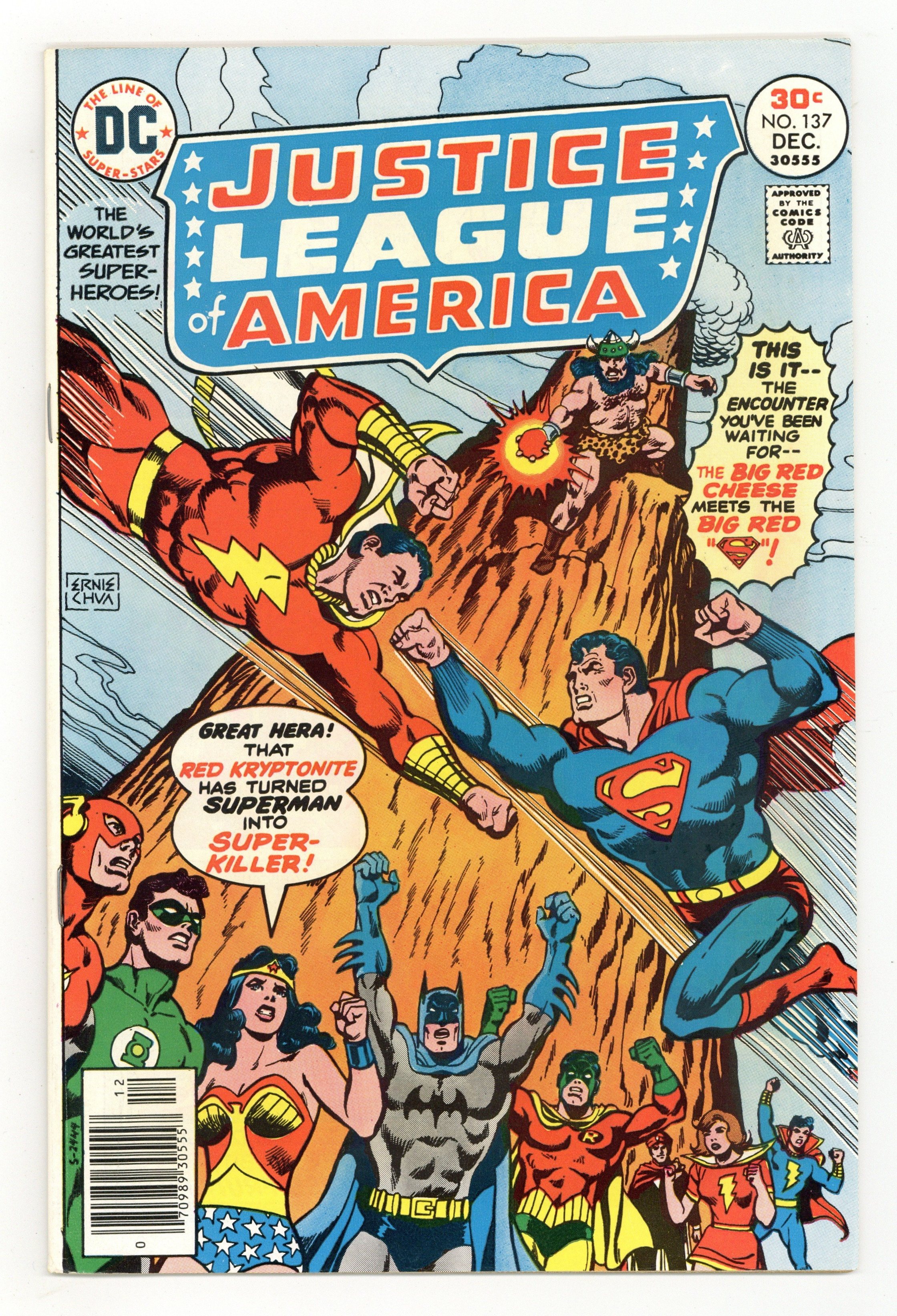 Cover pencils by Ernie Chan, inks by Frank McLaughlin. Crisis in Tomorrow!, script by E. Nelson Bridwell (plot) and Martin Pasko (script), pencils by Dick Dillin, inks by Frank McLaughlin; As the final part of King Kull's plan continues, it is yet thwarted again by the three groups of heroes, the JLA, JSA and Squadron of Justice; When Superman confronts Kull on the Rock of Eternity, however, he's turned into a killer by a dose of Red Kryptonite, and almost destroys Captain Marvel, but when Marvel utters 'Shazam!', the spell is broken and is saved by Superman while in freefall as Billy. Kull is then captured by the Marvel Family (who also free the trapped Pantheon of Gods and Goddesses), and the four triumphant heroic groups then leave back to their respective worlds from the Rock. 32 pgs. $0.30. Cover price $0.30.