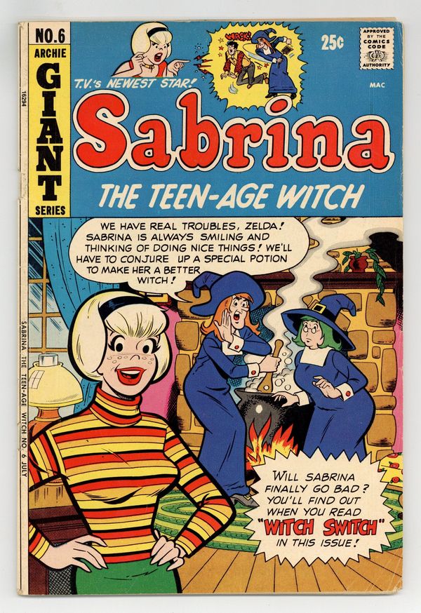 Cover pencils by Stan Goldberg, inks by Joe Sinnott. Witch Switch starring Sabrina, script and pencils by Al Hartley, inks by Joe Sinnott; Sabrina's aunts call in Hex, a handsome warlock who tries to show her the joys of doing evil. Which Watch is Which? starring Sabrina, script by Dick Malmgren, pencils by Stan Goldberg, inks by Joe Sinnott. Sabrina's Silly Singles, script by Dick Malmgren, pencils by Stan Goldberg, inks by Joe Sinnott. Freeze Tease! starring Li'l Jinx, script and art by Joe Edwards. Ghost Chasers starring Sabrina, script by Dick Malmgren, pencils by Stan Goldberg, inks by Jon D'Agostino. 52 pgs. $0.25. Cover price $0.25.