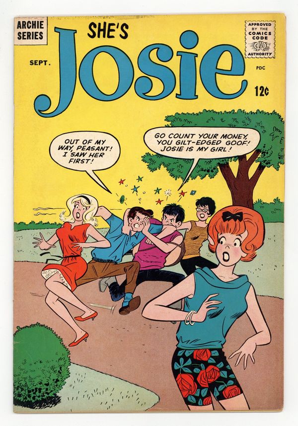 Cover pencils by Dan DeCarlo. The Unhappy Hero (Chapter 1); Albert and Alex are fighting over Josie again; Alex tries to throw Albert's guitar at him while he's crossing the street. Saved By the Belle (Chapter 2); In his gratitude, Albert follows Alex everywhere, never letting him have a moment alone with Josie. And Away We Go (Chapter 3); Following Melody's suggestion, Alex tries to let Albert save his life so they can be even. Happy Ending (Chapter 4); Alex and Josie try to escape from Albert's gratitude in a speedboat. Scripts by Frank Doyle, pencils by Dan DeCarlo, inks by Rudy Lapick. A Fishy Tale! humor page starring Li'l Jinx by Joe Edwards. 36 pgs. $0.12. Cover price $0.12.