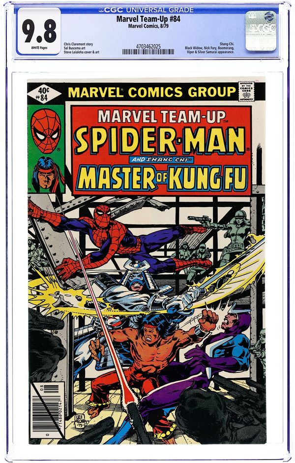 "Catch A Falling Hero" Part 3 of 4. Guest-starring Spider-Man, Shang-Chi, Nick Fury, and the Black Widow. Script by Chris Claremont. Art by Sal Buscema (breakdowns) and Steve Leialoha (finishes). Cover by Steve Leialoha. Finally, the Viper stands revealed as the mastermind behind the plot to destroy the Black Widow! But the anarchist has her eyes set on a bigger target after commandeering the giant SHIELD Heli-carrier! Meanwhile, Nick Fury recruits the Master of Kung Fu to help him stop the Viper's evil plans. And as the massive airship drifts towards the U.S. Capitol Building in Washington D.C.; Spider-Man, the Black Widow, Nick Fury, and Shang-Chi launch their airborne assault on the Heli-carrier! But be careful...Boomerang, the Viper, and the Silver Samurai are waiting inside! Flashback cameo by Nomad (aka Steve Rogers) to recap the Viper's prior appearance in Captain America 182. 36 pages. Cover price $0.40.