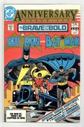 $22.50Direct Edition. 64-page giant. Cover by Jim Aparo. Final issue of the series-1st Appearance of Katana, 1st appearance of Geo-Force, and 1st appearance of Halo. The Golden Age Batman stars in "Smell of Brimstone, Stench of Death!", script by Mike Barr, pencils by Dave Gibbons, inks by Dave Gibbons (1-3, 20-40) and Gary Martin (4-19); The story explains how 2 different personas for Brimstone exist: Both aware somehow of each others' existences on a spiritual level; In 1955, on Earth-2, Brimstone's defeated by Batman and sent to prison, but later transfers his 'spiritual' essence to his doppelganger on Earth-1 in 1983 to restart his criminal empire; He learns of a Batman on this world, but is also defeated here by him; When his essence returns to its own body, it is a vegetable by this time, trapping him there for the rest of his natural life, while his 'good' Earth-1 counterpart is unaware of what happened. The contemporary Batman stars in "Hell on Earth!", script by Barr, art by Gibbons. Back-up story: 1st appearance of Batman and the Outsiders in a 16-page sneak preview, script by Barr, art by Jim Aparo. One-page Bat-Mite strip by Stephen DeStefano. 68 Pages, Full Color. Cover price $1.50.