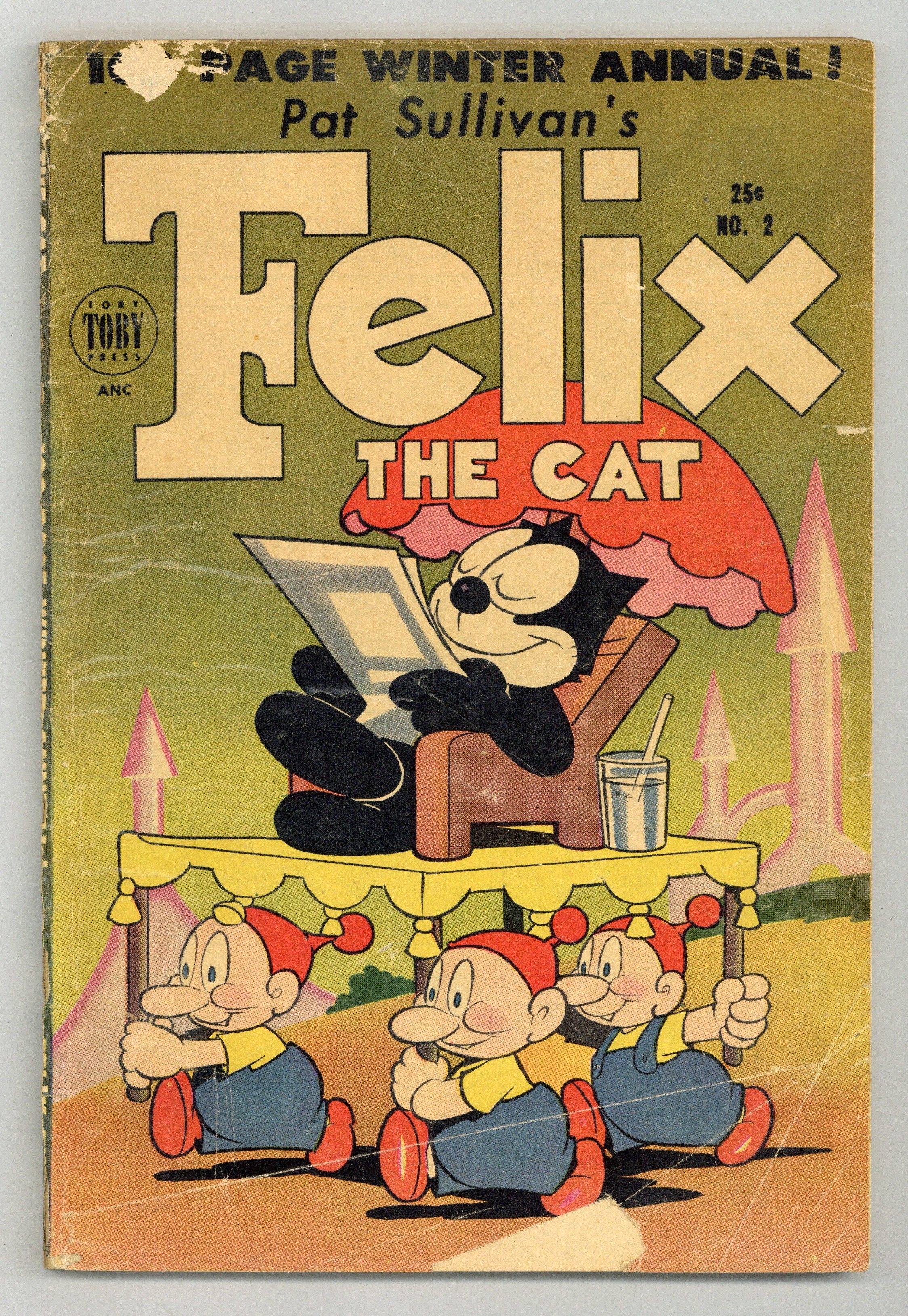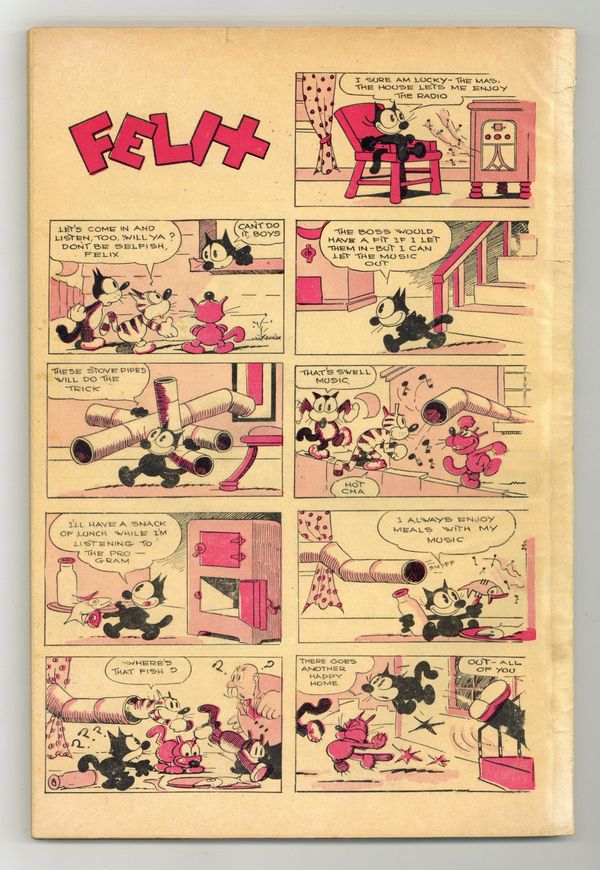 Cover by Otto Messmer. Stories and art by Otto Messmer. A collection of the Felix the Cat comic strip, reformatted to fit comic-book pages. Felix has an adventure in the land of the Little People. Back cover features a Felix paper doll by Messmer, with four different outfits. Squarebound, 100 pages, Full Color. Cover price $0.25.