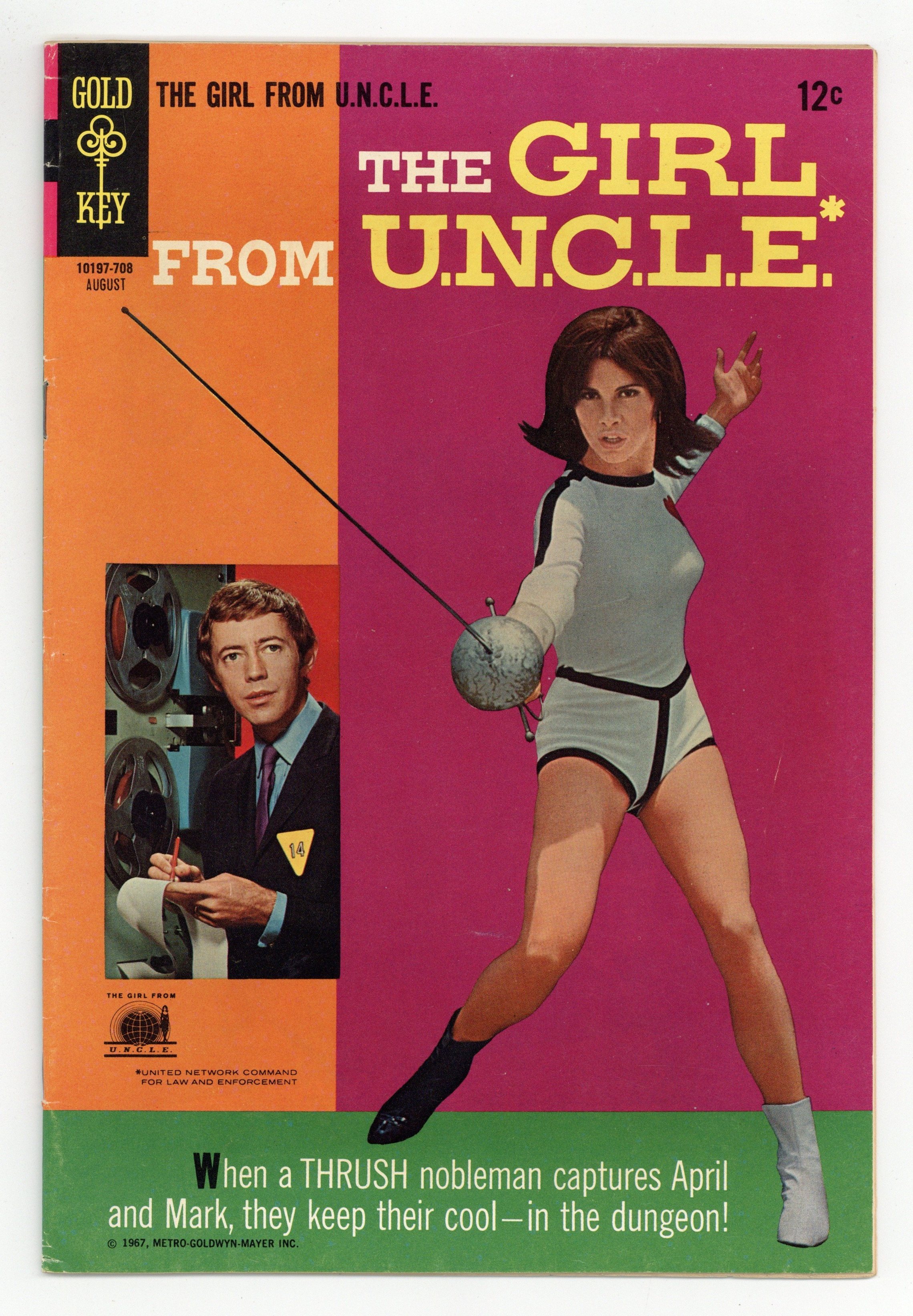 Comic book adaptation of the 1960s spy series "The Girl from U.N.C.L.E.," a spinoff from the popular "The Man from U.N.C.L.E." Photos on front, back, and inside front covers. Issue features "The One-Way Tourist Affair ? Act 1 The Mis-Guided Guide" and "Act 2 Caper in the Castle" in which agents April Dancer and Mark Slate are captured by T.H.R.U.S.H. when they investigate threats to military intelligence. Issue also has one-page features. No story/art credits given. # on cover 10197-708 August Cover price $0.12.