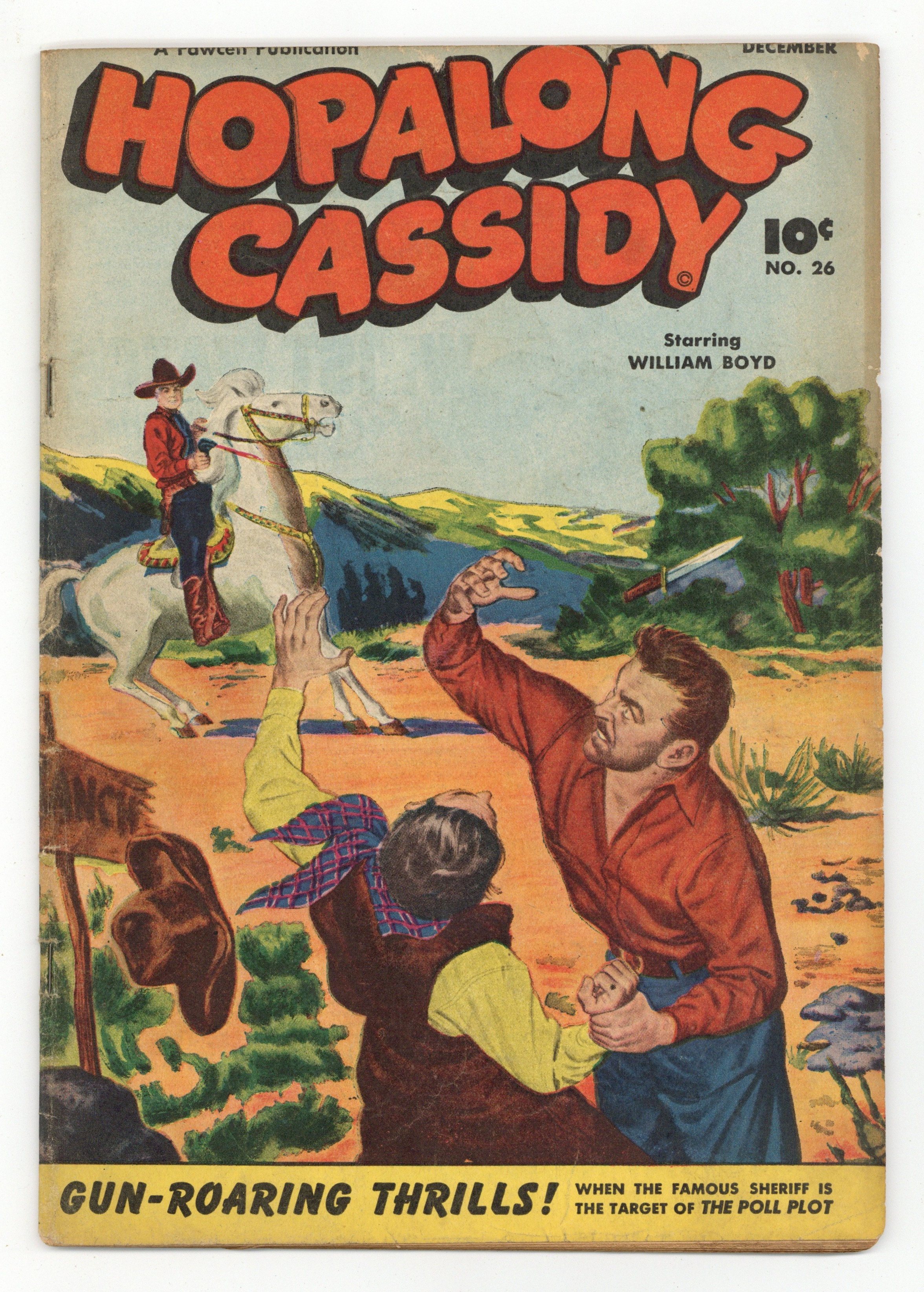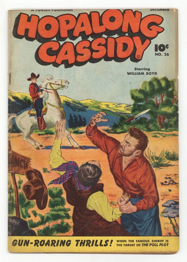 $26.00Captain Marvel Wrist Watch ad. "The Poll Plot," art by Joe Certa; Rex Galen is plotting to win the election as sheriff of Twin Rivers. Wheaties featuring Matty Bell. "The Girl on the Flying Trapeze!" starring Hopalong Cassidy, art by Joe Certa; A jealous circus artist tries to kill the new girl trapeze artist. "Hollow Trunk," art by Charles Quinlan; One of the boarders steal silverware and hide it in a hollow tree outside his window. Roy Rogers Quality Merchandise ad. Sissy Gift text story. Ridin' Herd with William Boyd article, art by Carl Pfeufer; A foreman never asks a pal to do anything he wouldn't do himself. "The Free Meal"; Whitey pretends to be sick just to get a free meal. "The Fatal Note" starring Hopalong Cassidy, art by Charles Quinlan; A false note is meant to break up a friendship. 52 pgs., full color. Cover price $0.10.
