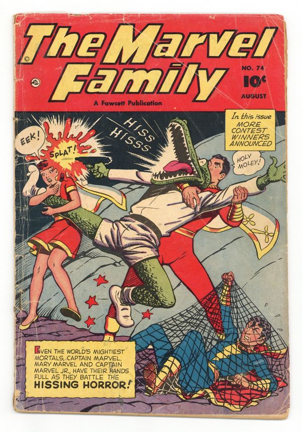 Cover by C. C. Beck. Stories and art by Otto Binder, C. C. Beck and Howard Boughner. Fawcett's most popular heroes, the original Captain Marvel (Shazam) and family, in solo and shared adventures. In an issue-length, multi-part adventure, The Marvel Family encounters the alligator-like Hissmen, who've traveled through their Time Tube from a million years in the past. The Marvels must change to human form to use the Time Tube, but then they are captured and transformed into Hissmen themselves by the Hissmaker Machine. The Hissing Horror, Chapter 1: Attack of the Missing Men; Lazy Lee; Boxcar Benny; The Marvel Family Puzzle Page; Chapter Two: Peril in the Past; Headline Harry: The Perfect Strategy; The Sure Hand; The Hotel Guest; Chapter 3: Battle of the Crossroads. 32 pages, Full Color. Cover price $0.10.