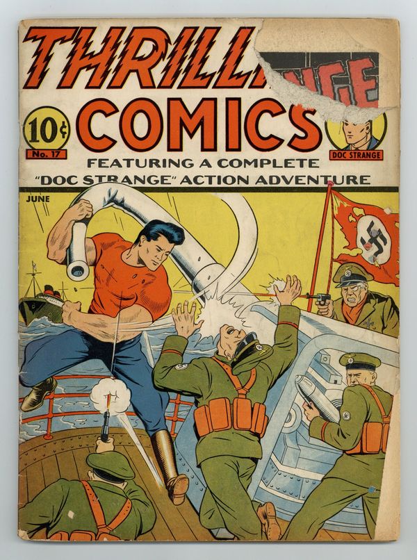 Cover by Kin Platt. Edited by Ned Pines. Stories by Richard Hughes, Kin Platt, Ed Wexler, George Mandel, Sam Brant, Ray Gill, and John Daly. Chock full of action and adventure, these are Thrilling Comics! 68 pgs. $0.10. Cover price $0.10.