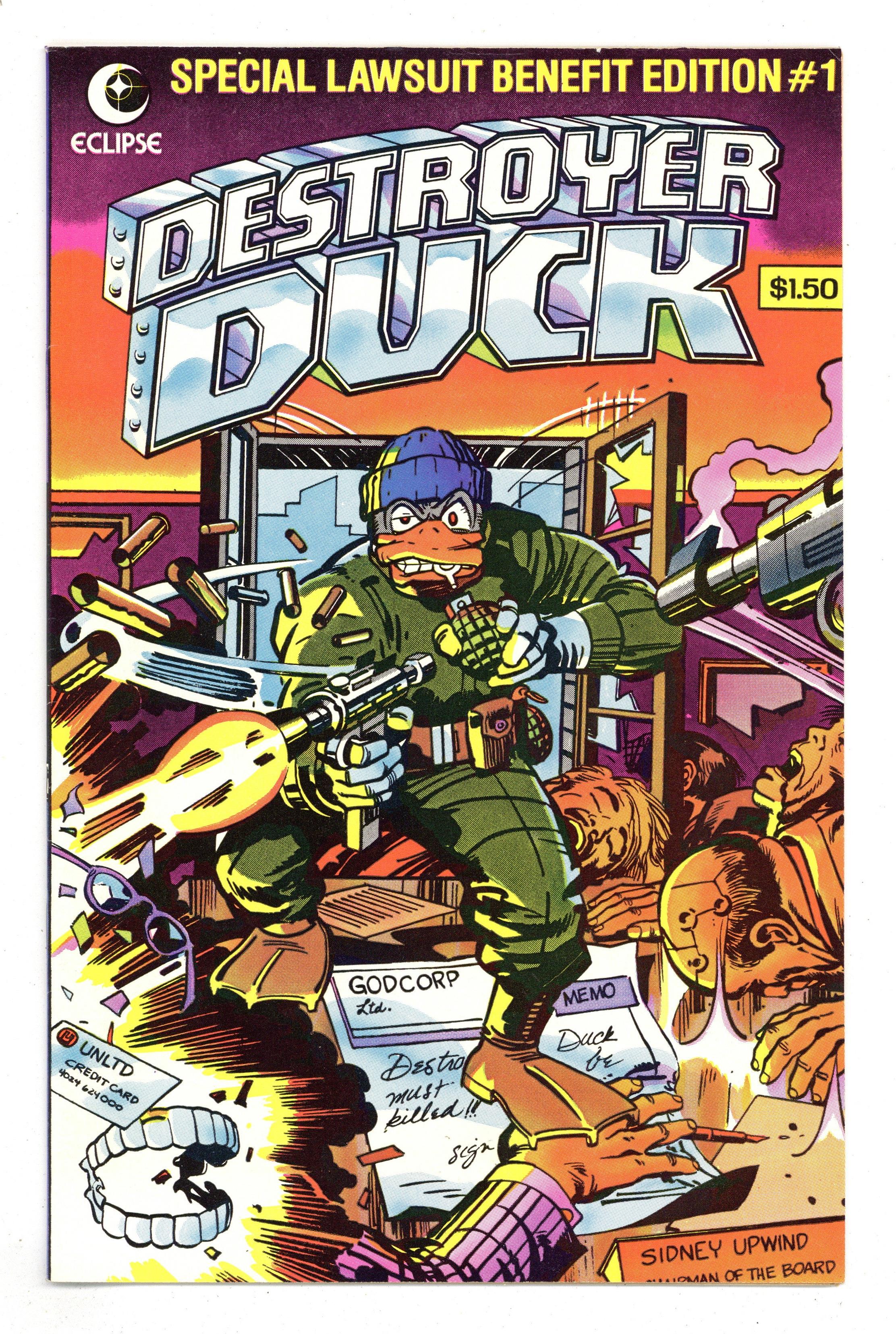 "Special Lawsuit Benefit Edition." At the height of their legal battles with Marvel, Steve Gerber and Jack Kirby teamed up for this benefit comic, in which a gun-slinging duck seeks revenge against an evil megacorporation. Art and stories donated by Mark Evanier, Dan Spiegle, Scott Shaw!, Alfredo Alcala, Steve Leialoha, Shary Flenniken, Martin Pasko, and Joe Staton. All this plus the first-ever appearance of Sergio Aragones' Groo the Wanderer. Full color; 36 pages. Cover by Kirby and Neal Adams! Cover price $1.50.