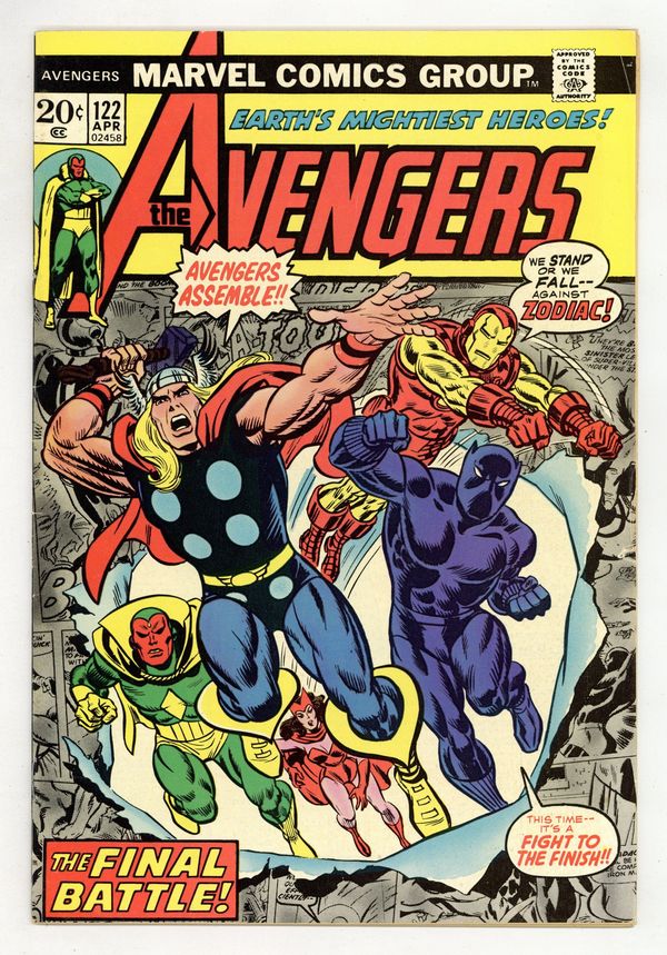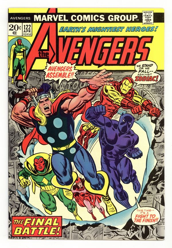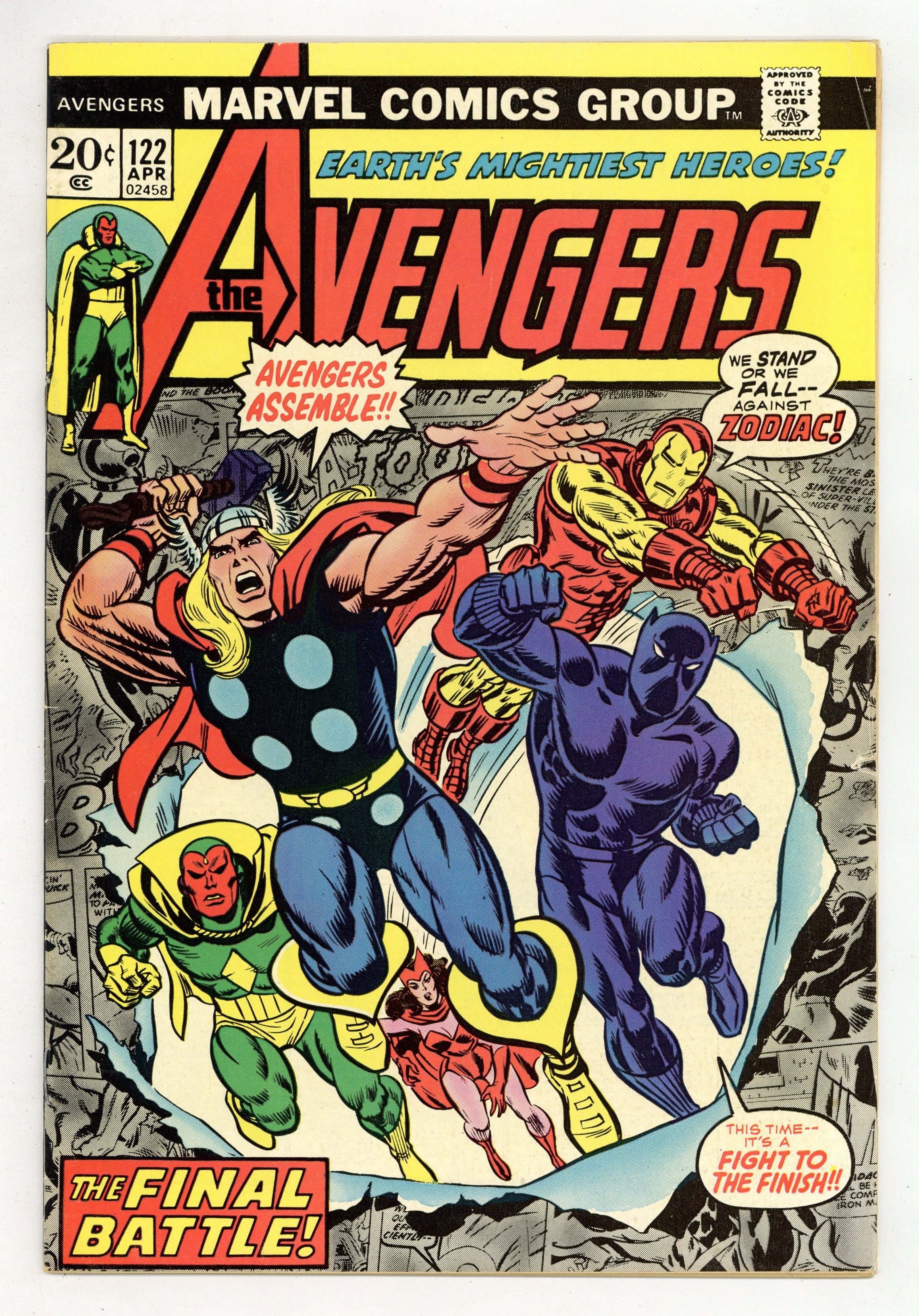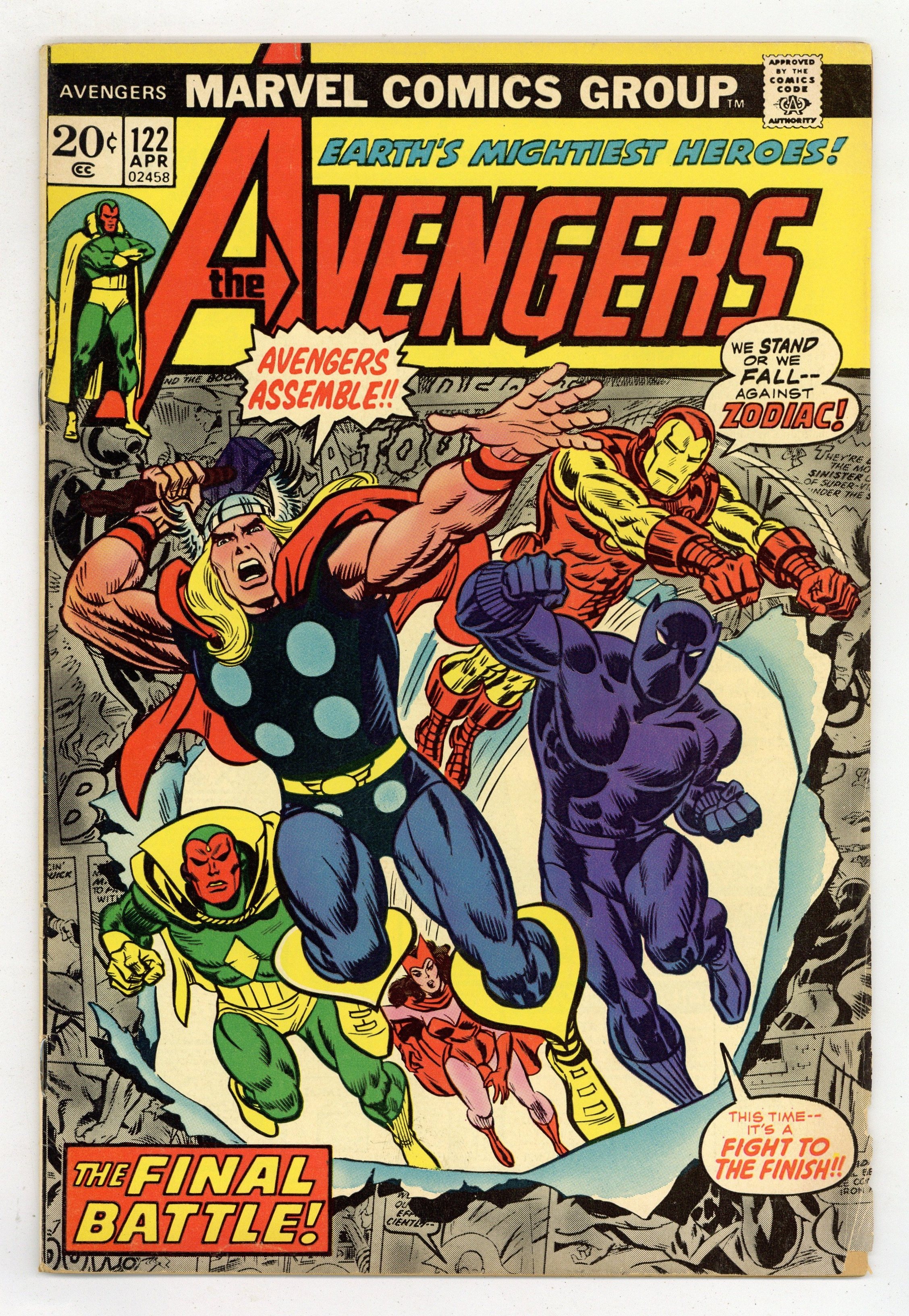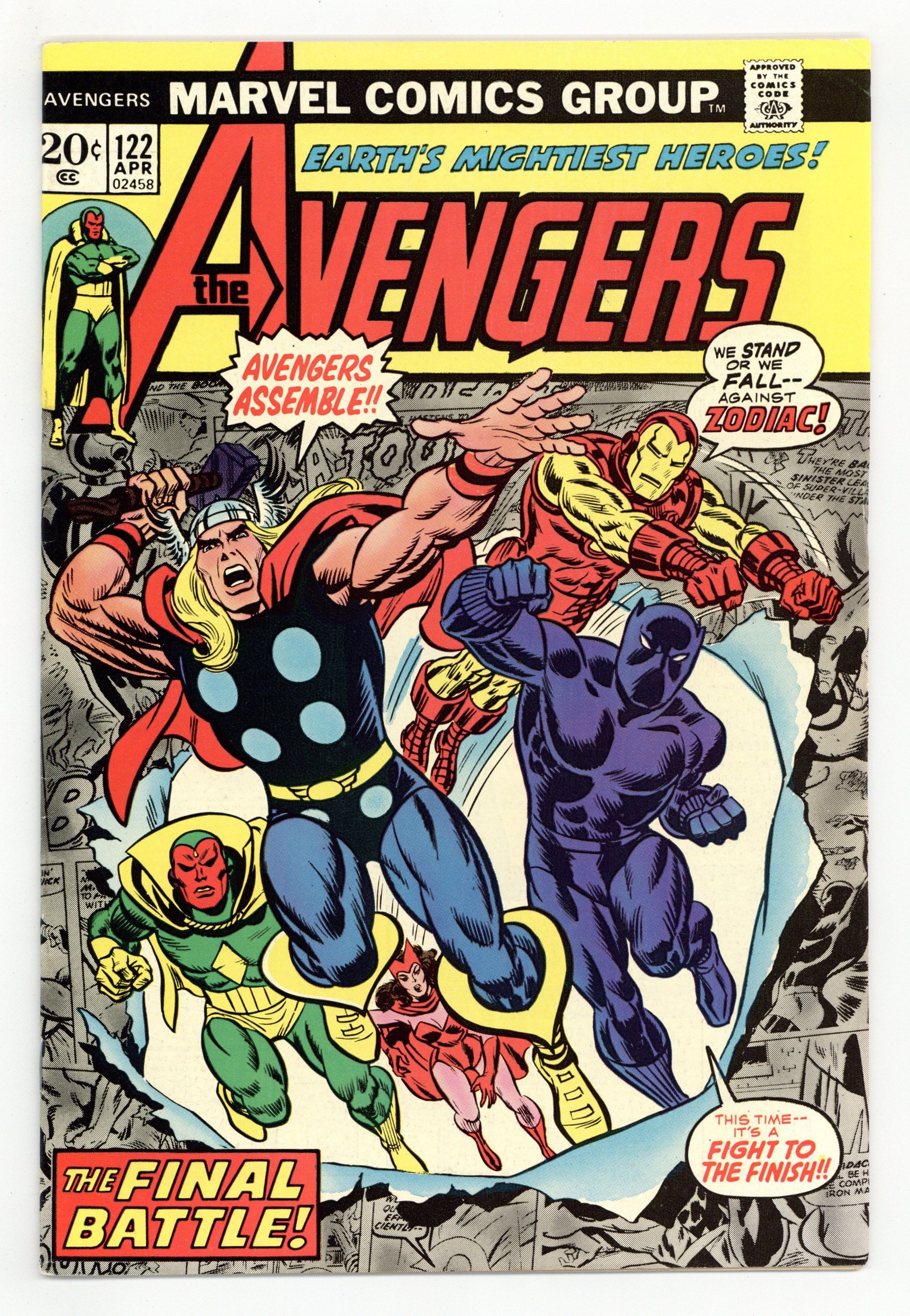 "Trapped in Outer Space!" Part 3 of 3. Script by Steve Englehart. Pencils by Bob Brown. Inks by Mike Esposito. Cover by Gil Kane and John Romita. Mere seconds ago Earth's Mightiest Heroes invaded Cornelius Van Lunt's New Jersey warehouse! But little did they realize the warehouse was actually a spaceship! And now five avengers and seven renegade zodiac are rocketing into outer space! Will the Avengers find their destiny written in the stars? Hopefully not like this! Fortunately though, another rebellious zodiac member, Libra, steals Taurus' star-cruiser and rescues both the heroes and the villains! And that sets the stage for one last free-for-all between the Avengers and the Zodiac! Can Thor, Shell-Head, T'Challa, Mantis, Wanda, and the Vision finally knock down the twelve houses of the Zodiac? Last 20¢ issue. (Notes: The cover to Avengers 122 is widely considered one of Gil Kane's best for Marvel. The Avengers on the cover are busting through pages from issue 120. The letters page contains a letter from comics artist Rick Hoberg. The letters page also contains Marvel Value Stamp Series A #81 The Vision by John Buscema.) 36 pages Cover price $0.20.