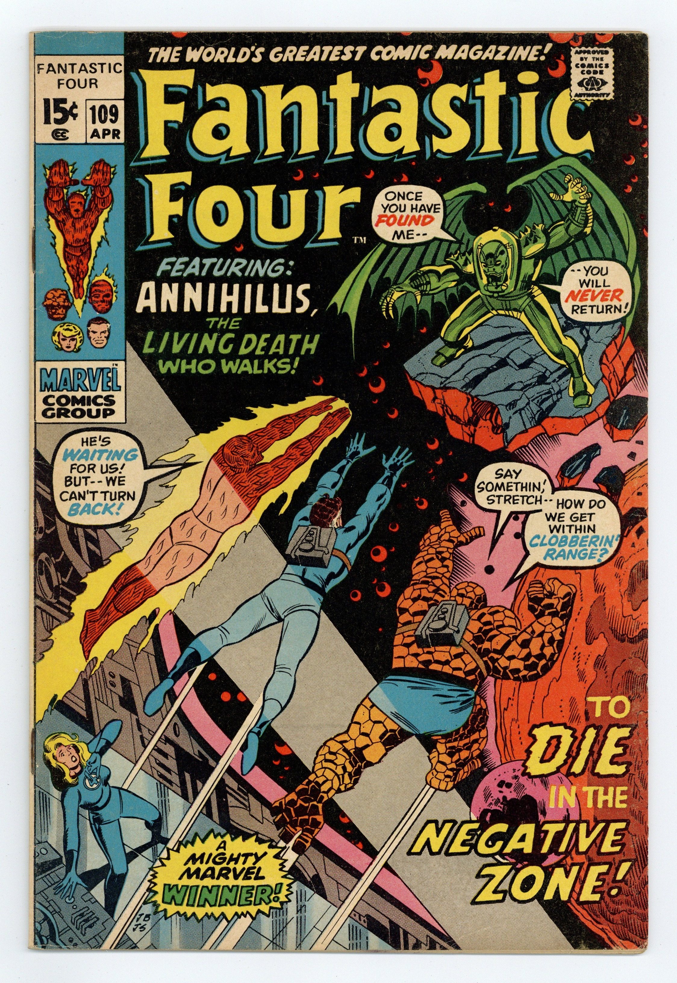 "Death in the Negative Zone!" Script by Stan Lee. Pencils by John Buscema. Inks by Joe Sinnott. Cover by John Buscema and Joe Sinnott. Janus wants to conquer the Negative Zone! Annihilus wants to conquer the Earth! And the Fantastic Four are caught in the middle! But before either the Nega-Man or Annihilus can reach their destinations, they must do battle against one another first! Meanwhile Reed, Ben, and Johnny cross over into the antimatter universe to thwart Annihilus' plans! However, the Lord of the Negative Zone is virtually unbeatable in his kingdom! It's a super showdown: the Thing, Human Torch, and Mr. Fantastic vs. Annihilus! Cameo appearance by Agatha Harkness. (Note: The letters page contains a statement of ownership: average print run 518,737; average paid circulation 285,639.) 36 pages Cover price $0.15.
