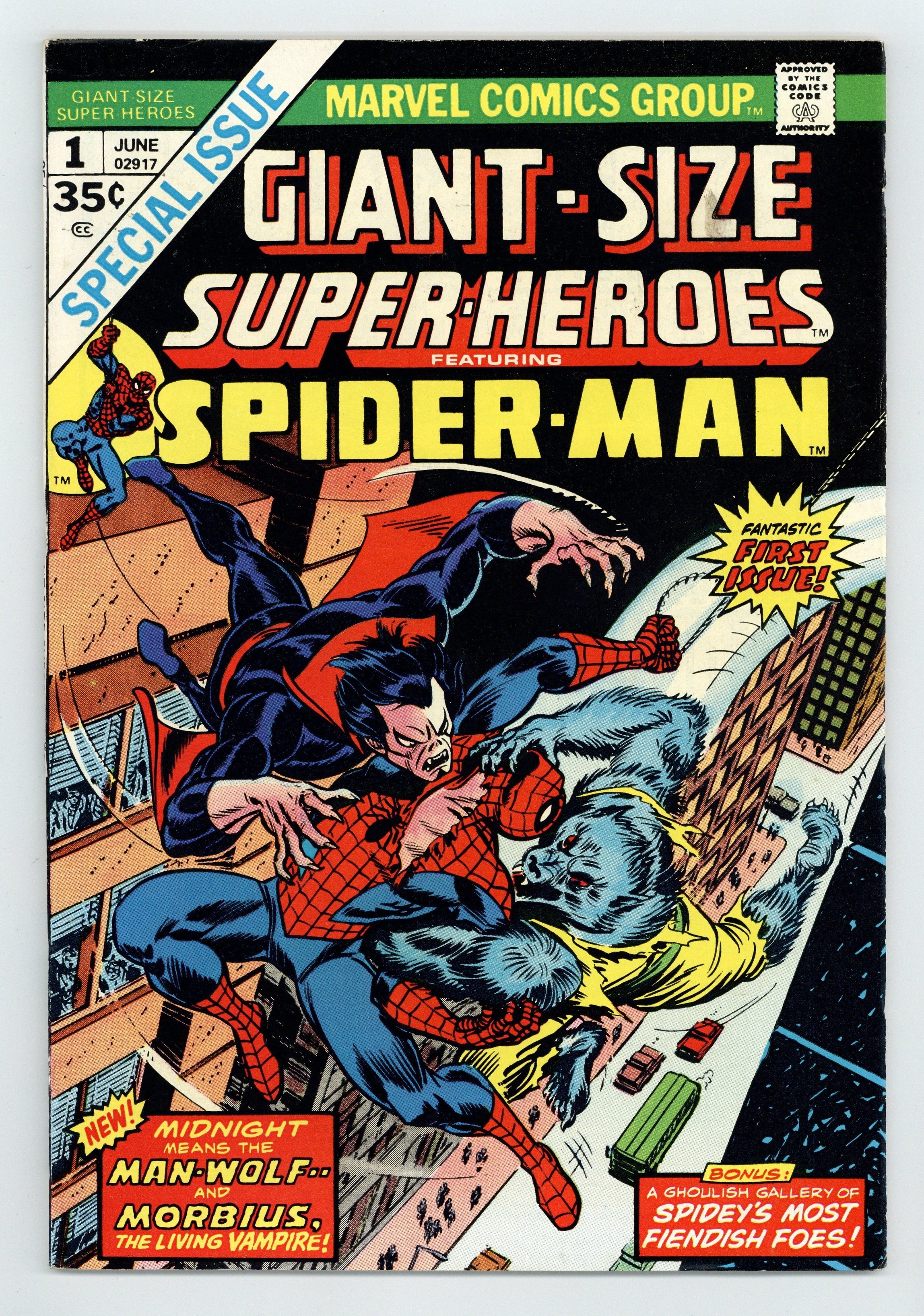 Starts May 4 48-page giant. "Man-Wolf At Midnight!" Guest-starring Spider-Man. Script by Gerry Conway. Pencils by Gil Kane. Inks by Mike Esposito. Cover by Gil Kane and John Romita. Morbius the Living Vampire in stalking Manhattan again! His first target is John Jameson, the Man-Wolf; and his second one ? the Amazing Spider-Man! Once Morbius reattaches the moonstone to John Jameson's neck, the Man-Wolf becomes his to command! Now under the cover of darkness, the deadly duo heads to Empire State University to break into the research laboratory, but the ever-present web-slinger intercepts them along the way! Can Spider-Man defeat these two creatures of the night? This issue includes a 1-page write-up from Roy Thomas describing the updated plans for Marvel's various Giant-Size series. This issue also contains a full-page Spider-Man pin-up by John Romita and a 6-page rogues' gallery of famous web-slinger foes drawn by Steve Ditko (reprinted from Amazing Spider-Man Annual 1). Back up feature: "How Stan and Steve Create(d) Spider-Man!" 3-page story also reprinted from Amazing Spider-Man Annual 1. (Note: The last panel of the main story indicates that there would be another issue of Giant-Size Super-Heroes; however, a second issue was never published.) Cover price $0.35.
