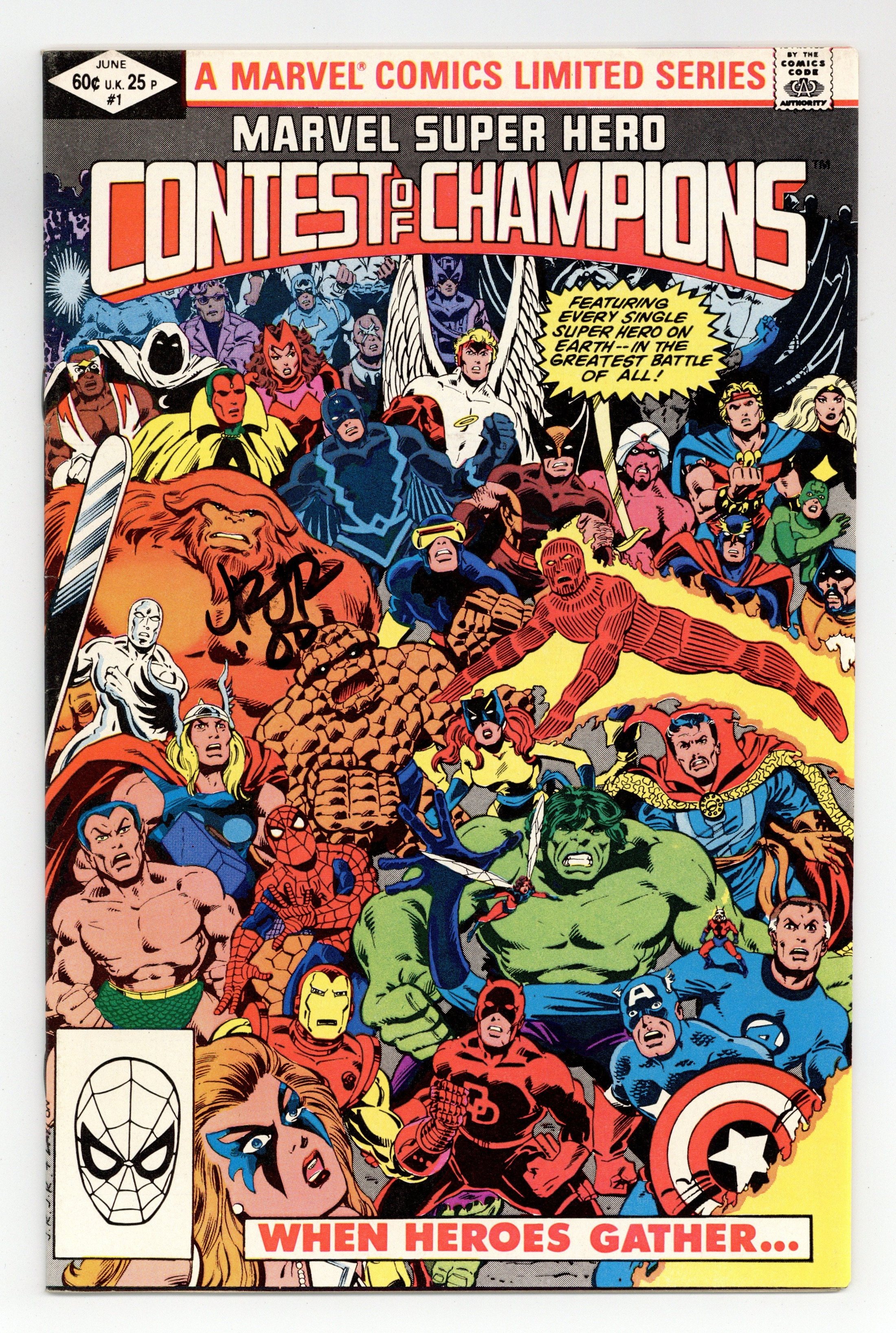 Direct Edition. "Chapter 1: A Gathering of Heroes!" Guest-starring every super hero in the Marvel Universe. Story by Mark Gruenwald, Bill Mantlo, and Steven Grant. Art by John Romita, Jr. and Pablo Marcos. Cover by John Romita, Jr. and Bob Layton. The world's super heroes mysteriously disappear from Earth and then reappear in a giant arena in outer space. The Grandmaster and Death herself have decided to use the Earth's super heroes as pawns in a game they are playing against one another. If the Grandmaster wins the game, his brother, the Collector, will be restored to life. Both the Grandmaster and Death select 12 heroes to fight for their side and find the four pieces of the golden globe of life. Whichever team finds the most pieces wins! (Notes: Contest of Champions was the first Marvel Limited Series. The last two pages of this issue begin an index listing and description of each Marvel super hero.) 32 pages Cover price $0.60.