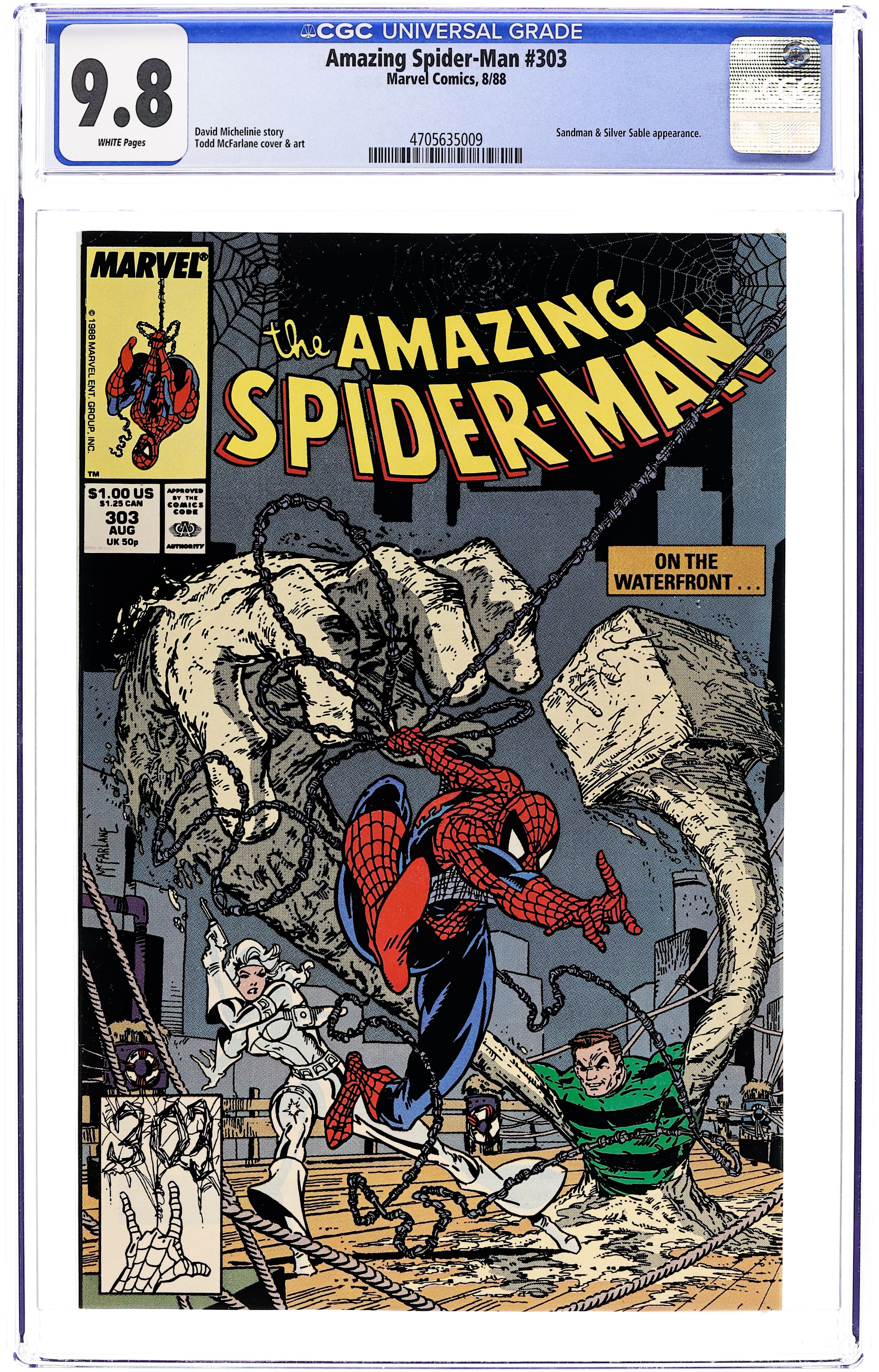 Direct Edition. "Dock Savage!" Guest-starring Silver Sable. Script by David Michelinie. Art by Todd McFarlane. Cover by Todd McFarlane. While trying to make up his mind about the research company's job offer in Kansas, the wondrous wall-crawler receives another employment offer! However, this one is from Silver Sable and requires brawn not brains! The Symkarian mercenary wants Spider-Man to team up with the Sandman to take down a neo-nazi and his private army! The web-slinger quickly accepts sable's offer and swings into action! As for the other offer, your friendly neighborhood Spider-Man has to talk to his wife first! Cameo appearances by Mary Jane Watson and J. Jonah Jameson. (Notes: Beginning with this issue, Todd McFarlane produces small drawings in the UPC box on the front cover. These sketches only appear on the cover of the direct sales issues. The newsstand editions have the regular bar code.) 36 pgs. Cover price $1.00.