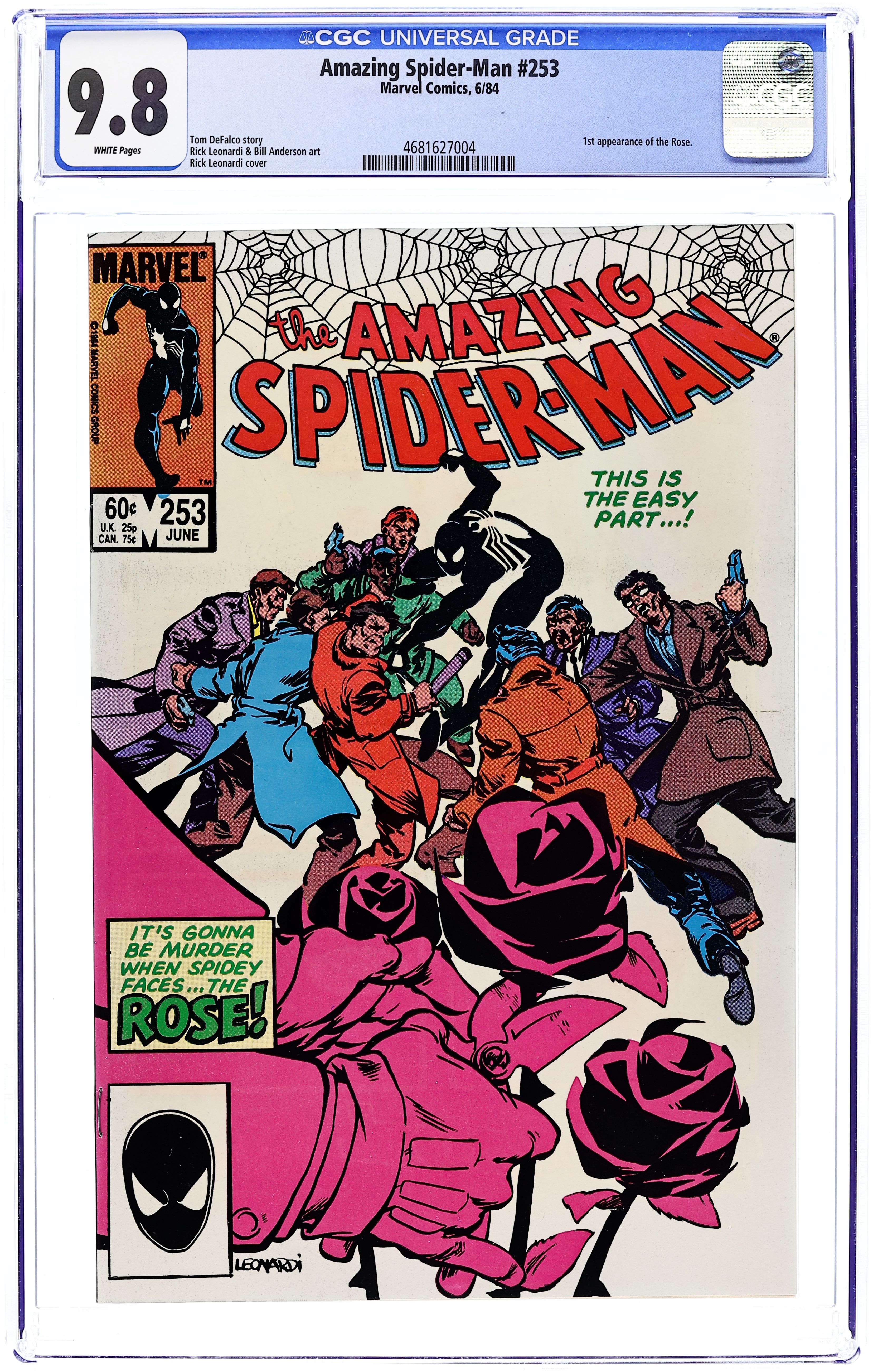 Direct Edition. "By Myself Betrayed!" First appearance of the Rose. Script by Tom DeFalco. Pencils by Rick Leonardi. Inks by Bill Anderson. Cover by Rick Leonardi. It's the debut of a new underworld super-villain...the Rose! And as the web-slinger finds out...this rose has plenty of nasty thorns! The star quarterback of New York's football team is on the take! And when the Rose orders him to throw his upcoming playoff game, the QB fights back! But the Rose's thugs are coming on an all-out blitz! And without the wall-crawler's help, the quarterback will get sacked...permanently! Meanwhile, Peter tells his aunt that he has dropped out of graduate school. It does not go well...to say the least! Cameo appearances by Joe Robertson, Betty Brant Leeds, and Aunt May. (Notes: The Rose becomes a major adversary for Spider-Man over the next three years. This story was reprinted in Marvel Tales 267.) 36 pages. Cover price $0.60.