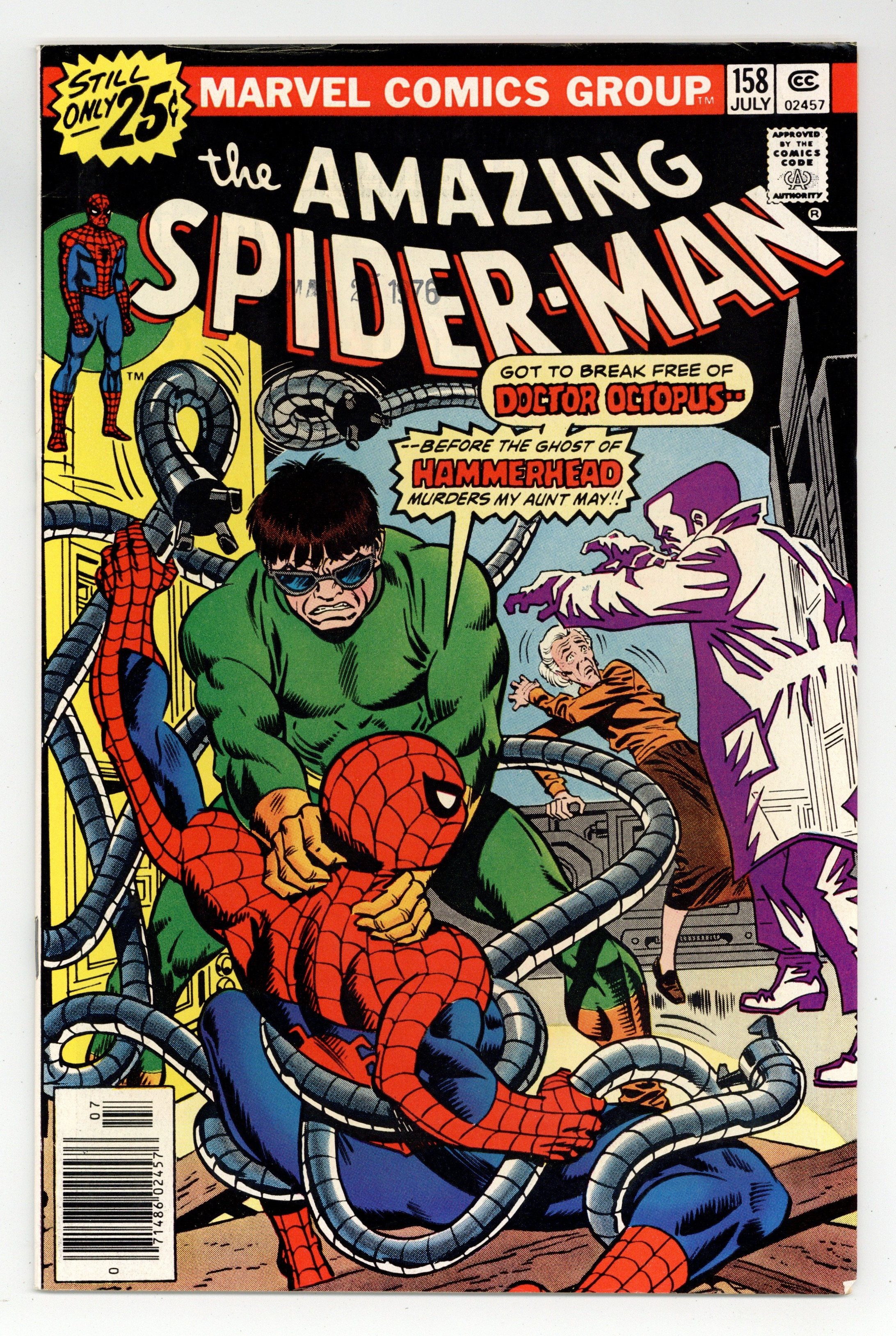 Tags: Marvel Legacy Numbering: Amazing Spider-Man (part 158), Spider-Man$17.25"Hammerhead is Out!" Part 2 of 3. Script by Len Wein. Pencils by Ross Andru. Inks by Mike Esposito. Cover by Ross Andru and Frank Giacoia. After surviving his free fall from the helicopter, the wondrous wall-crawler continues his pursuit of Dr. Octopus and Aunt May! The six-armed super-villain takes refuge at Brookhaven National Laboratory to draw Hammerhead's ghost into a deadly trap! But the sudden arrival of the web-slinger throws off Doc Ock's plan! Instead of destroying the ghost, Octopus' equipment returns Hammerhead to flesh and blood! And that sets the stage for the next issue's three-sided tussle: Doctor Octopus vs. Hammerhead vs. your friendly neighborhood Spider-Man! Cameo appearances by Mary Jane Watson, Glory Grant, Joe Robertson, and J. Jonah Jameson. (Notes: This issue contains a full-page ad for Hostess Twinkies featuring Captain America vs. the Red Skull. This story was reprinted in Marvel Tales 135. A 30-cent cover price variant exists for this issue.) 36 pages. Cover price $0.25.