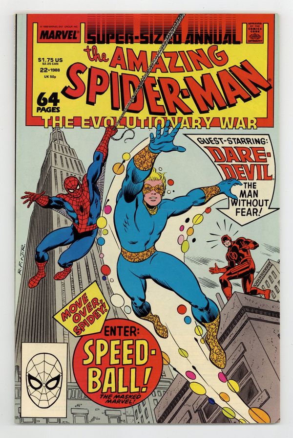 $6.30Direct Edition. "Drug War Rages" Guest-starring Daredevil and Speedball. Part 5 of the Evolutionary War storyline. First appearance of Speedball. Plot by Tom DeFalco. Script by David Michelinie. Pencils by Mark Bagley. Inks by Mike Esposito. Cover by Ron Frenz and Joe Rubinstein. What begins as a simple drug bust in a west side warehouse...escalates into a battle atop the Empire State Building to save the lives of everyone in the Big Apple! Along the way the Amazing Spider-Man teams up with a familiar ally, the Man Without Fear; and meets a new superhero: Speedball (aka Robbie Baldwin)! The High Evolutionary wants to sterilize New York's population to eradicate DNA strands deemed to be undesirable! Can the web-slinger, Daredevil, and Speedball defeat the Purifiers and maintain the gene pool status quo? The Evolutionary War storyline continues in Fantastic Four Annual 21. Appearances by the Kingpin, Arranger, Madeline Naylor, Mary Jane Watson, Ben Urich, and J. Jonah Jameson. First backup story: "He Who Laughs..." Plot by Steve Ditko. Script by Roger Stern. Pencils by Steve Ditko. Inks by Jackson Guice. Speedball battles a crazy stagehand seeking revenge against his mother. Second backup story: "Kindred Spirits" Story by Mark Gruenwald. Pencils by Ron Lim. Inks by Tony DeZuniga. Chapter 6 of the High Evolutionary's history. Inside his Wundagore Mountain citadel, Edgar Wyndham creates Bova -- the future nanny of Quicksilver and the Scarlet Witch; and foolishly ignores Magnus' warning that the spirit of Chthon is bound to Wundagore Mountain. First backup feature: Spider-Man and J. Jonah Jameson pin-up by Larry Lieber and Frank Giacoia. Second backup feature: 2-page diagram of Peter and Mary Jane's Bedford Towers apartment. Third backup feature: Two unpublished Amazing Spider-Man covers -- the first by Larry Lieber & Jack Abel; the second by Bob Layton. (Note: Fantastic Four Annual 21 is the 6th part of the Evolutionary War storyline, but the 5th chapter of the history presented in the backup stories.) 68 pages. Cover price $1.75.