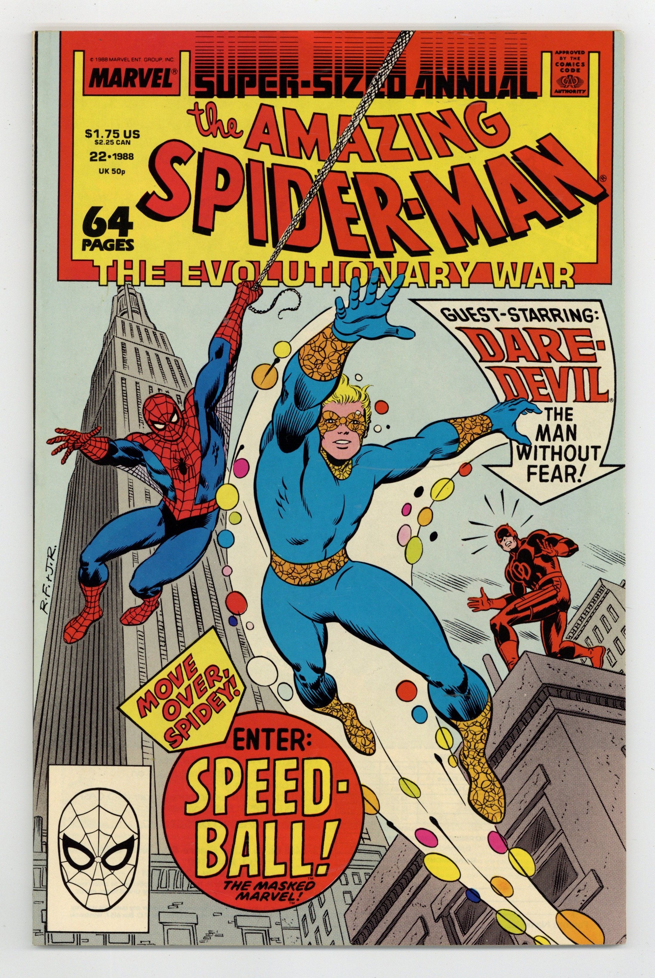 $7.30Direct Edition. "Drug War Rages" Guest-starring Daredevil and Speedball. Part 5 of the Evolutionary War storyline. First appearance of Speedball. Plot by Tom DeFalco. Script by David Michelinie. Pencils by Mark Bagley. Inks by Mike Esposito. Cover by Ron Frenz and Joe Rubinstein. What begins as a simple drug bust in a west side warehouse...escalates into a battle atop the Empire State Building to save the lives of everyone in the Big Apple! Along the way the Amazing Spider-Man teams up with a familiar ally, the Man Without Fear; and meets a new superhero: Speedball (aka Robbie Baldwin)! The High Evolutionary wants to sterilize New York's population to eradicate DNA strands deemed to be undesirable! Can the web-slinger, Daredevil, and Speedball defeat the Purifiers and maintain the gene pool status quo? The Evolutionary War storyline continues in Fantastic Four Annual 21. Appearances by the Kingpin, Arranger, Madeline Naylor, Mary Jane Watson, Ben Urich, and J. Jonah Jameson. First backup story: "He Who Laughs..." Plot by Steve Ditko. Script by Roger Stern. Pencils by Steve Ditko. Inks by Jackson Guice. Speedball battles a crazy stagehand seeking revenge against his mother. Second backup story: "Kindred Spirits" Story by Mark Gruenwald. Pencils by Ron Lim. Inks by Tony DeZuniga. Chapter 6 of the High Evolutionary's history. Inside his Wundagore Mountain citadel, Edgar Wyndham creates Bova -- the future nanny of Quicksilver and the Scarlet Witch; and foolishly ignores Magnus' warning that the spirit of Chthon is bound to Wundagore Mountain. First backup feature: Spider-Man and J. Jonah Jameson pin-up by Larry Lieber and Frank Giacoia. Second backup feature: 2-page diagram of Peter and Mary Jane's Bedford Towers apartment. Third backup feature: Two unpublished Amazing Spider-Man covers -- the first by Larry Lieber & Jack Abel; the second by Bob Layton. (Note: Fantastic Four Annual 21 is the 6th part of the Evolutionary War storyline, but the 5th chapter of the history presented in the backup stories.) 68 pages. Cover price $1.75.