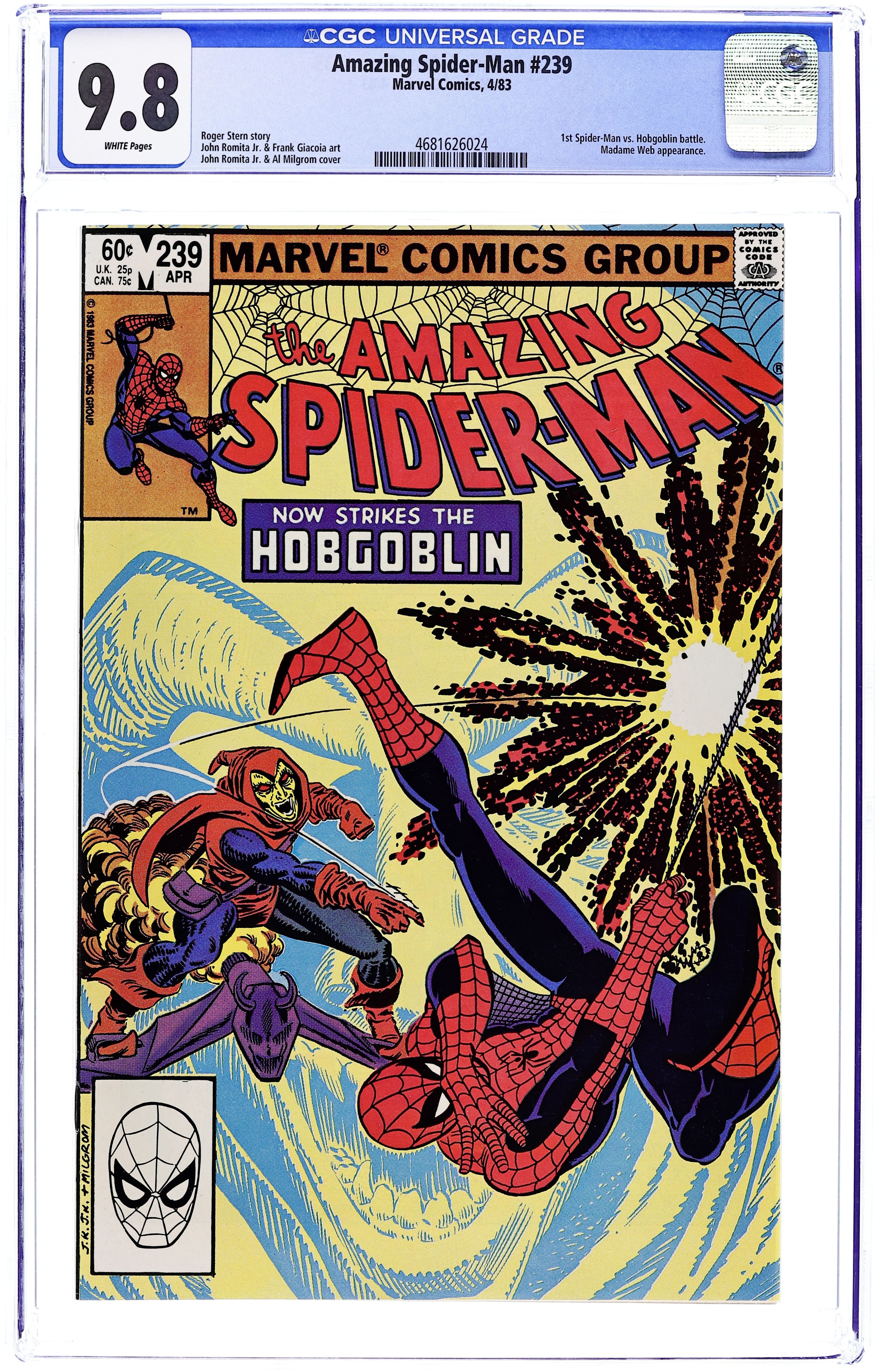 Tags: Marvel Legacy Numbering: Amazing Spider-Man (part 239), Spider-Man$31.50Direct Edition. "Now Strikes the Hobgoblin!" Second appearance of the Hobgoblin. Script by Roger Stern. Art by John Romita Jr. (breakdowns) and Frank Giacoia (finishes). Cover by John Romita Jr. and Al Milgrom. It's the first fight between the Hobgoblin and the Amazing Spider-Man! And the all-out action begins after the web-slinger bumps into the new goblin at one of Norman Osborn's old hideouts! Spidey is very familiar with the goblin's bag of tricks! But the overmatched Hobgoblin doesn't have any idea about the wall-crawler's speed, strength, and agility! Is the Hobgoblin's criminal career going to be over before it even starts? An outstanding issue! Cameo appearances by Harry Osborn, Madame Web, Captain DeWolff, and the Black Cat. (Notes: The Hobgoblin returns in Amazing Spider-Man 244. This issue was reprinted in Marvel Tales 258.) 36 pages. Cover price $0.60.