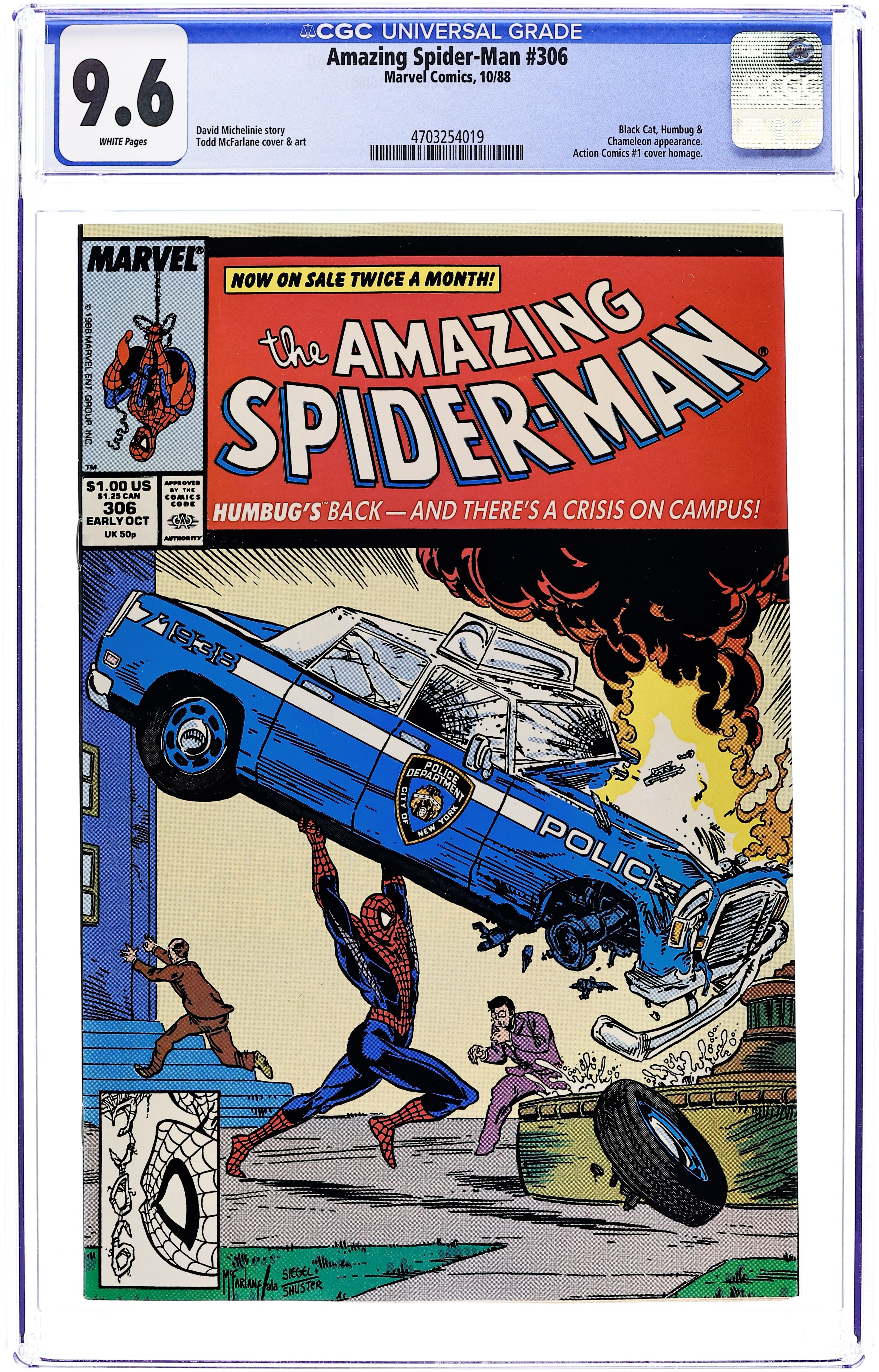 Direct Edition. "Humbugged!" Script by David Michelinie. Art by Todd McFarlane. Cover by Todd McFarlane. The pesky Humbug is back! And the insect-infatuated villain wants to resume his research on the ESU campus! But the crazy entomologist runs into his most-reviled insect first: the Spectacular Spider-Man! Let the extermination begin! Meanwhile at Bedford Towers, Peter and Mary Jane's neighbor, Jonathon Caesar, is acting stranger and stranger...perhaps even a bit obsessive! Cameo appearances by the Chameleon, Aunt May, and the Black Cat. (Notes: The Humbug previously appeared in Web of Spider-Man 19. McFarlane's cover is a tribute to the 50th anniversary of Superman and the cover of Action Comics #1.) 36 pgs. Cover price $1.00.