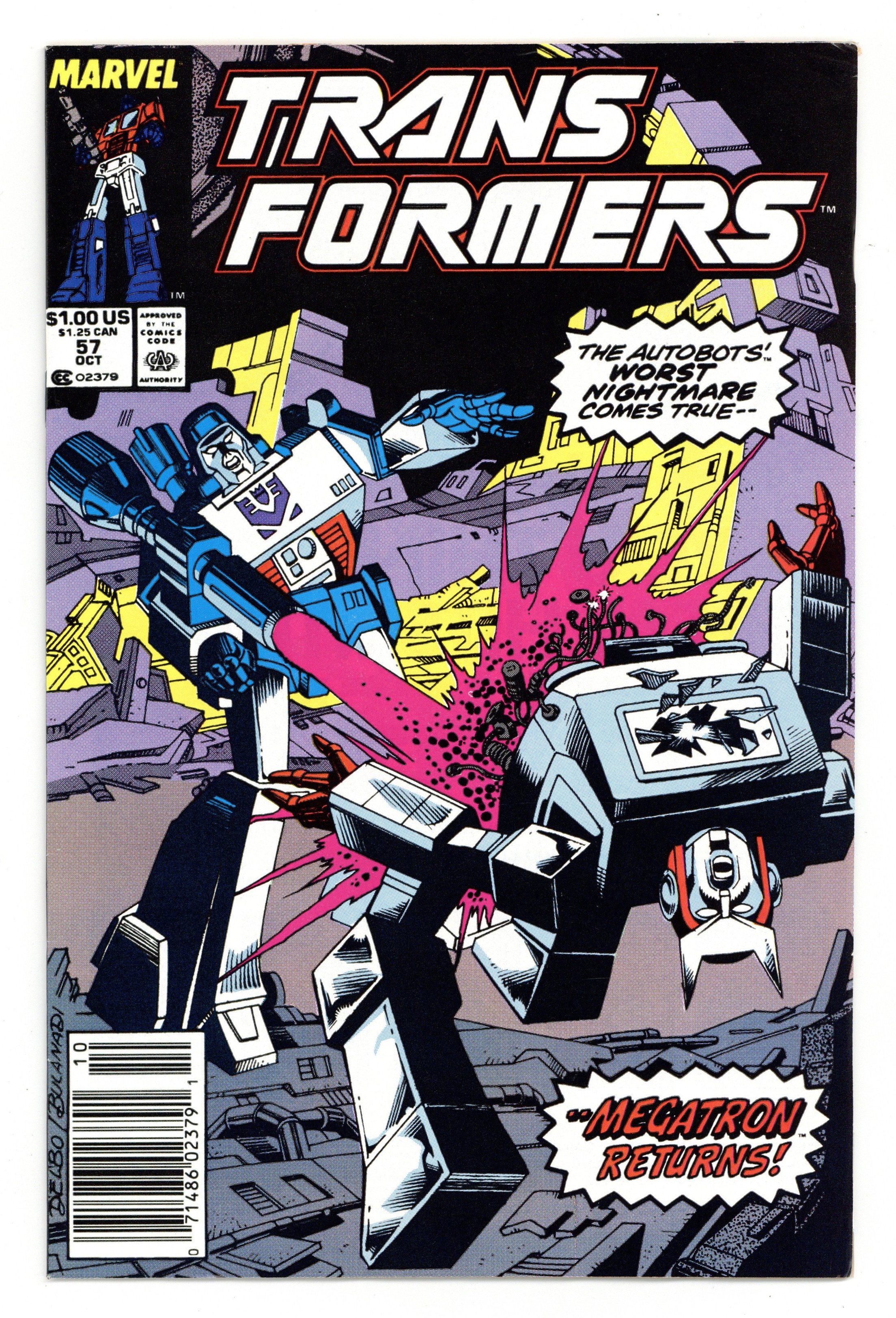 Megatron, who blew himself up back in issue #25, is back and has Ratchet prisoner in the Ark while Optimus Prime realizes that the attack on the air base was a ruse. And how did Megatraon survive that explosion? Find out in The Resurrection Gambit. Script by Simon Furman and art by Jose Delbo & Dave Hunt. Cover by Jose Delbo and Danny Bulanadi. Issue also has profile pages on Overkill and Slugfest Decepticons and Cloudraker Autobot. Cover price $1.00.