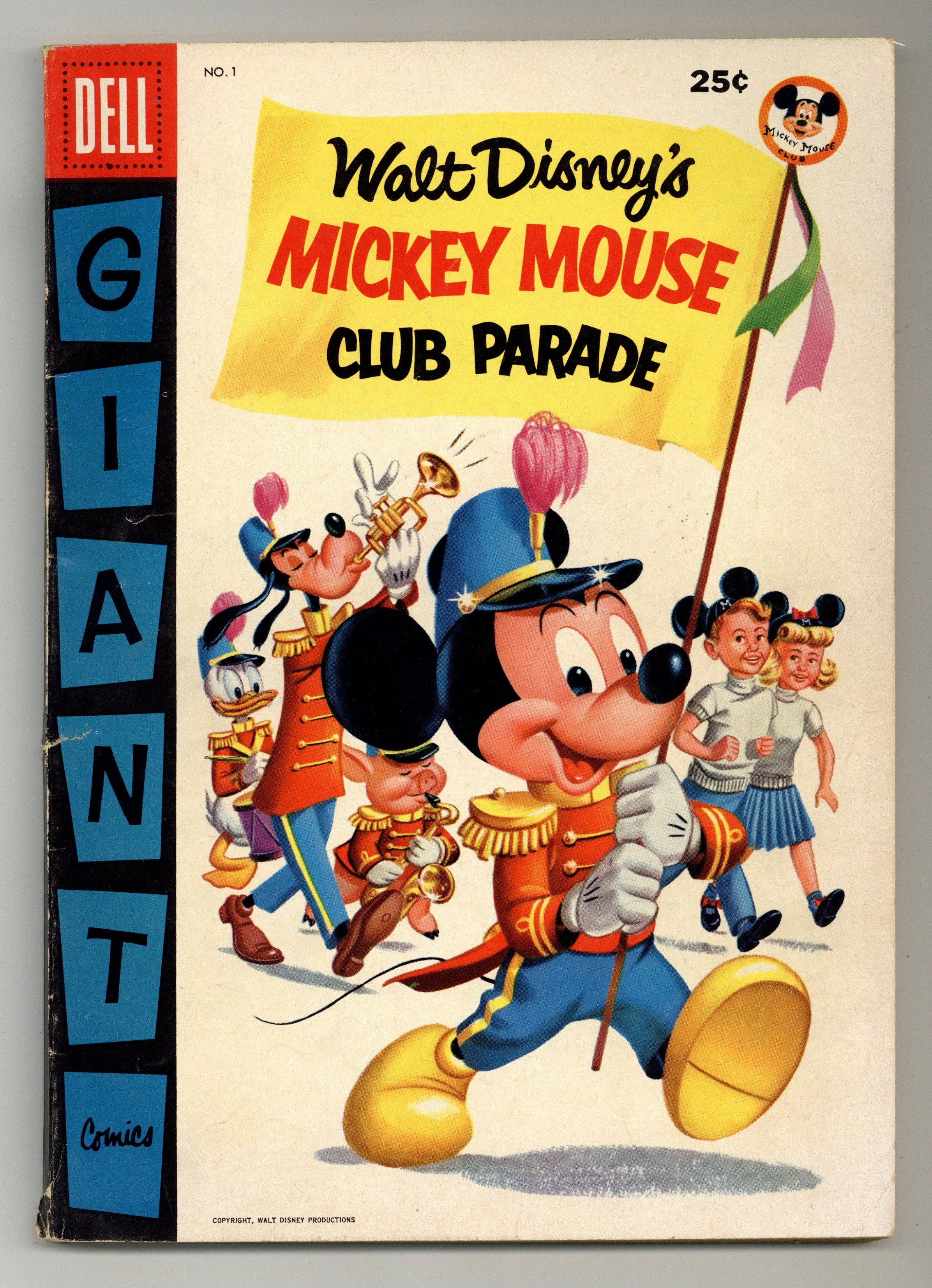 Painted cover by Dick Moores and Don MacLaughlin. Stories and art by Floyd Gottfredson, Ted Osborne, Ted Thwaites, Paul Murry, Al Hubbard, Harvey Eisenberg, Al Taliaferro, and Merril De Maris. One of a series of 100-page specials Dell produced with the Disney characters, this one featuring Mickey Mouse. In a reprint of the classic Floyd Gottfredson story from the Mickey Mouse comic strip, Mickey investigates stolen cameras, and encounters the supervillain called the Phantom Blot for the first time! A comics adaptation of The Wise Little Hen, the first Disney cartoon to feature Donald Duck. Ambrose the Robber Kitten runs away from home to become a bandit, but Dirty Bill teaches him that a bandit's life isn't as romantic as all that. Mickey Mouse Outwits the Phantom Blot; The Wise Little Hen; Ambrose, the Robber Kitten; Peculiar Penguins; The Mouseketeers Fun Game. 100 pages, Full Color. Cover price $0.25.