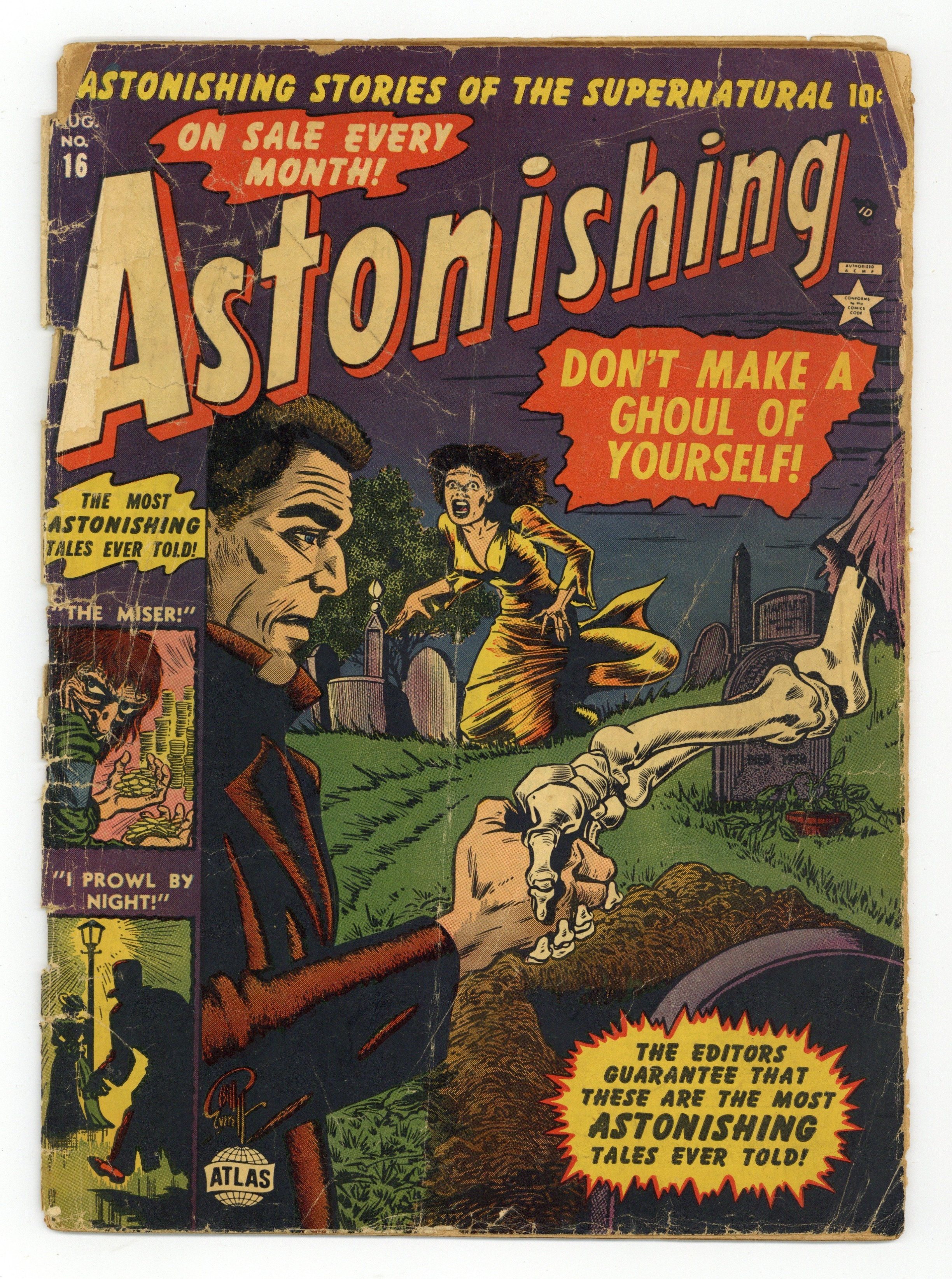 Cover by Bill Everett. "I Prowl at Night!", art by Syd Shores; An American stationed at the American embassy in Hungary hits a werewolf who had just changed back into human form with his car and crashes; The ambulance takes the both of them to the hospital and gives him a transfusion with the dying man's blood since it is the same type; He begins to feel the effects of the werewolf blood, so he flees his wife so as not to transfer the curse to her. "The Flying Saucers" text story. "Terror In Jimmy's House," pencils by Edwin Goldfarb, inks by Bob Baer. "The Miser," art by Bernie Krigstein. "Don't Make a Ghoul of Yourself!", pencils by Dick Ayers, inks by Ernie Bache. 36 pgs., full color. $0.10. Cover price $0.10.