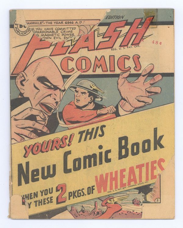 6 1/2 x 8 1/4. 32 pages. Flash stars in "The Criminal From Tomorrow!" Johnny Thunder stars in "Farewell To Crime!" Hawkman stars in "The Scavenger of the Skies!" (art by Joe Kubert). Also in this issue: "The Ghost Patrol." GRADING NOTES: All known copies were taped to Wheaties boxes and are never found in NM condition.