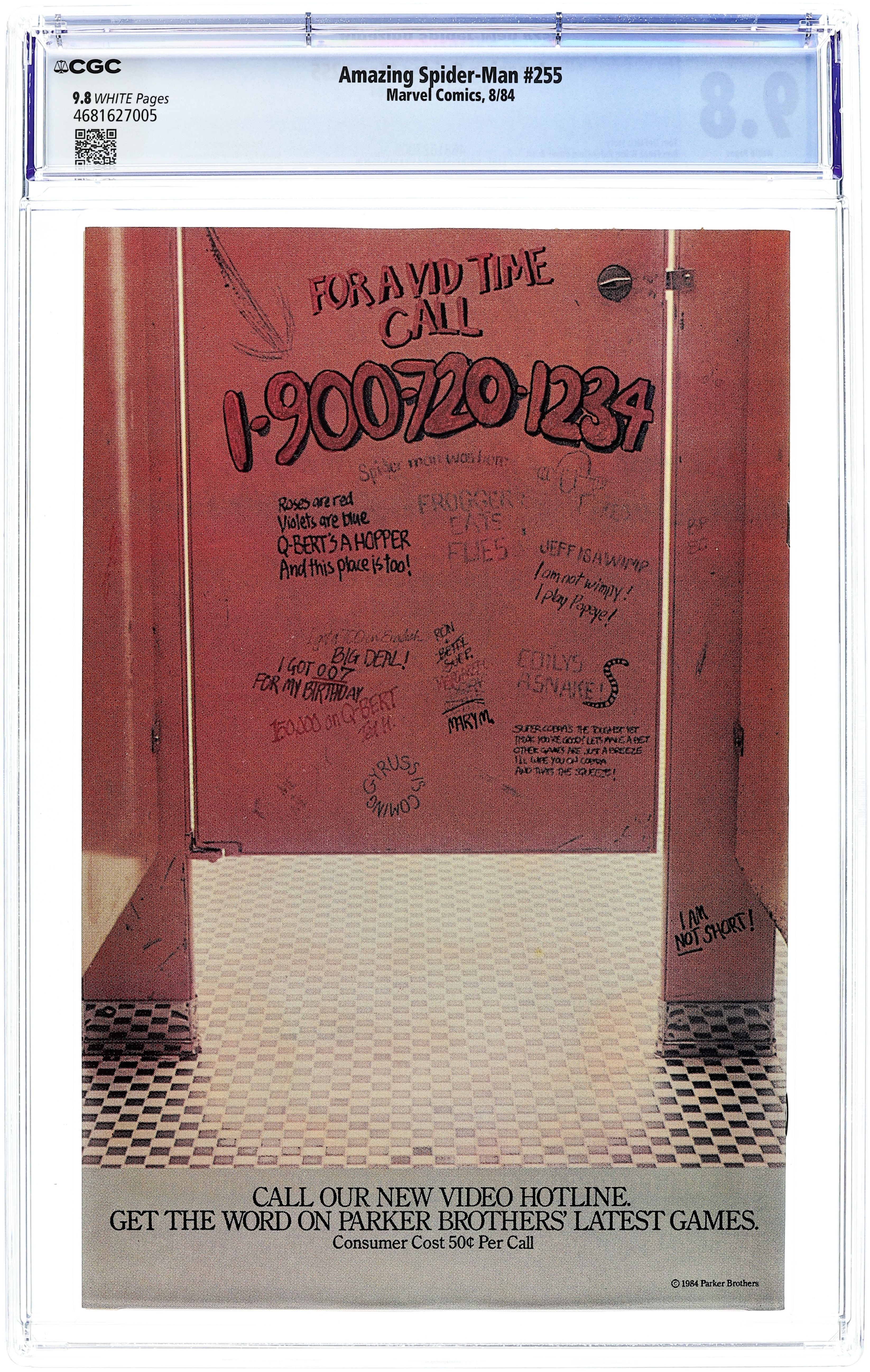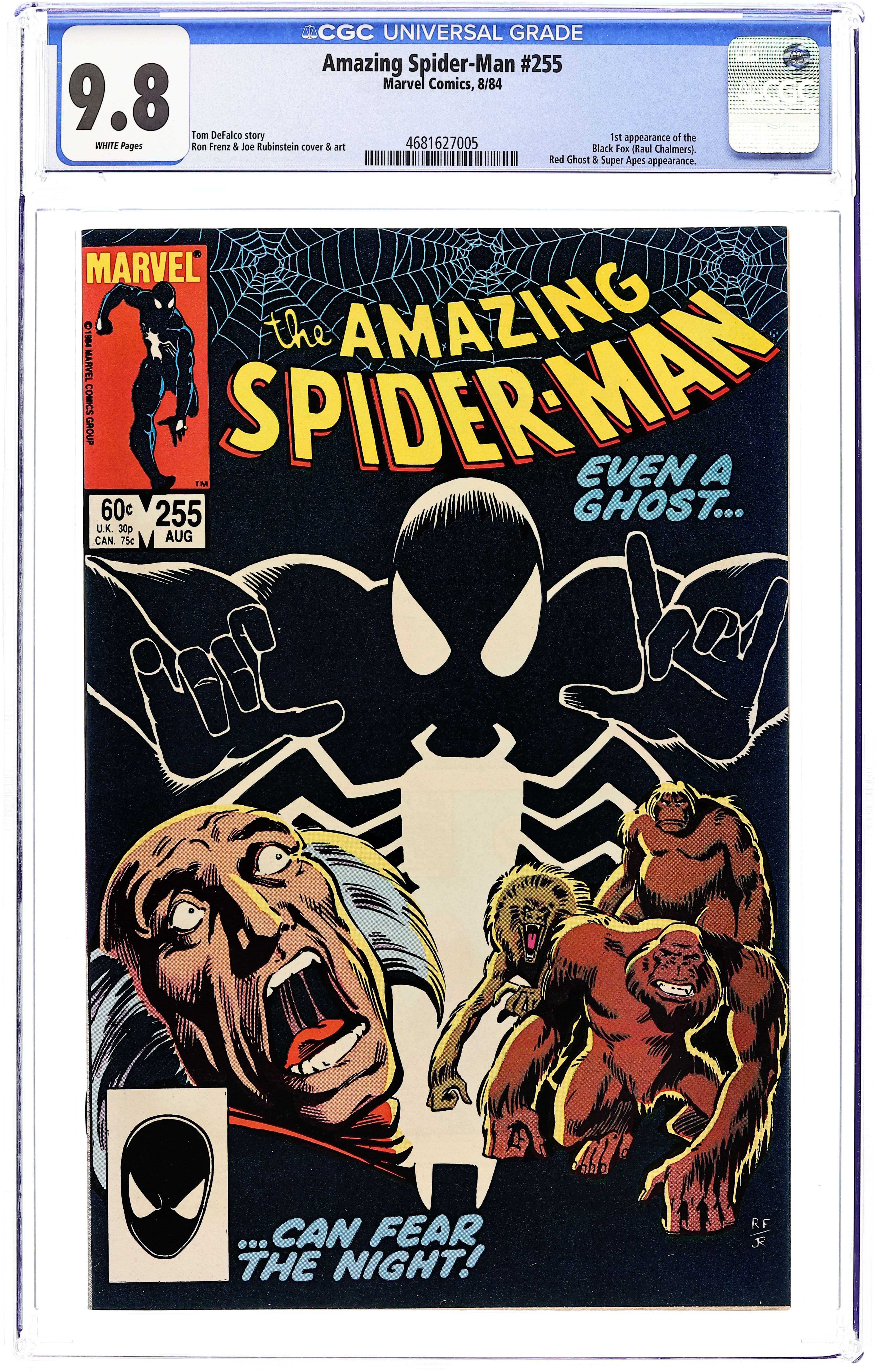 Direct Edition. "Even a Ghost Can Fear the Night!" Script by Tom DeFalco. Pencils by Ron Frenz. Inks by Joe Rubinstein. Cover by Ron Frenz and Joe Rubinstein. The international jewel thief extraordinaire known as the Black Fox breaks into an upscale Manhattan apartment! But regrettably for the aging burglar, the residents of the apartment are none other than the Red Ghost and his Super Apes! After capturing the would-be thief, the Soviet super-villain decides to put the fox to work for himself! When the Black Fox (with the Super Apes in tow) burglarizes a local jewelry store, he encounters another problem...the Amazing Spider-Man! Can Spidey juggle one fox, one ghost, and a trio of apes? Meanwhile, the web-slinger's new black (symbiote) costume begins acting strangely while its wall-crawling host is asleep! First appearance of the Black Fox. Cameo appearance by the Hobgoblin. Flashback cameos by the Fantastic Four, Iron Man, and Jack O'Lantern. (Notes: The Red Ghost returns in Quasar 6. The Black Fox appears again in Amazing Spider-Man 265.) 36 pages. Cover price $0.60.