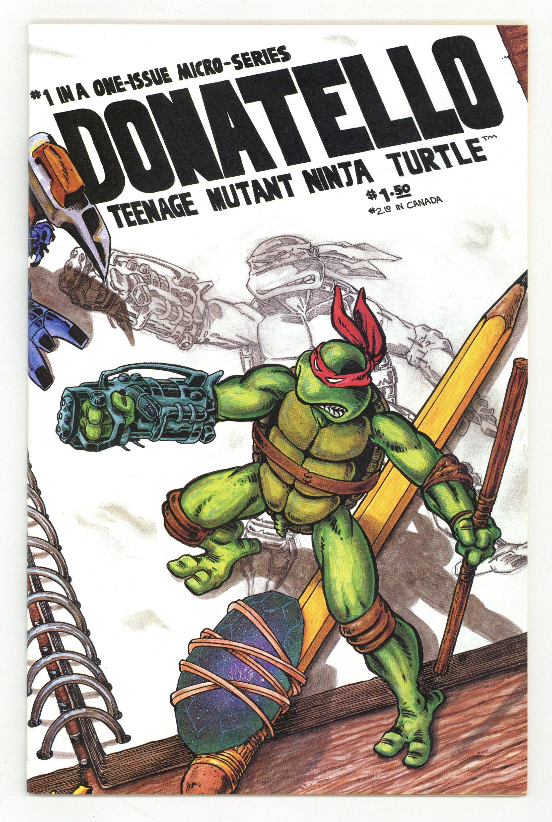 Donatello of the Teenage Mutant Ninja Turtles meets an artist (based on comics legend Jack Kirby) who has discovered a way to bring his drawings to life. Part of a series of one-shots featuring the Turtles in solo stories. Story by Kevin Eastman and art by Peter Laird. Black and white; 40 pages. Cover by Laird. Cover price $1.50. Cover price $1.50.