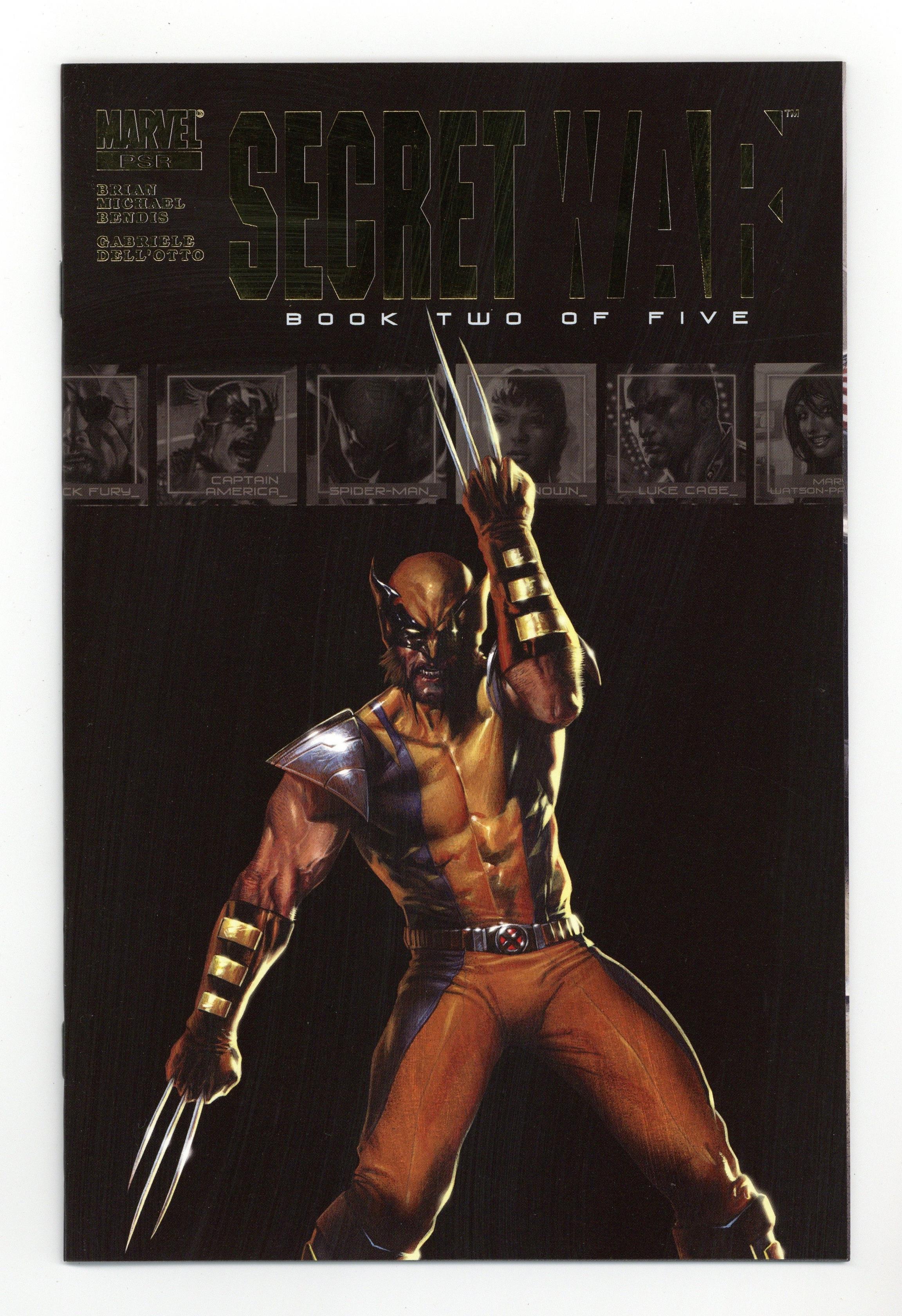 Gold Foil Logo. Written by Brian Michael Bendis. Art and Cover by Gabriele Dell'Otto. The super hero event of the year continues! A year ago, Nick Fury covertly gathered a group of heroes and sent them incognito to Latveria. Once there, he explained that the Latverian government had been funding tech based villains in the U.S. and he has brought the good guys here to bring down that government. In the present, Captain America punches Fury for the events that happened during their Secret War, events that have ended up putting Luke Cage in a coma. Plus: Character bios of the heroes in "S.H.I.E.L.D. Operations Database." Characters in this issue: Nick Fury; Captain America [Steve Rogers]; Spider-Man; Luke Cage; Daredevil; Wolverine; Black Widow; Daisy Johnson; CAMEOS: Mary Jane Parker; Danny Rand [Iron Fist]; Jessica Jones; Grizzly; Killer Shrike. 48 pages, full color. Marvel PSR Cover price $3.99.