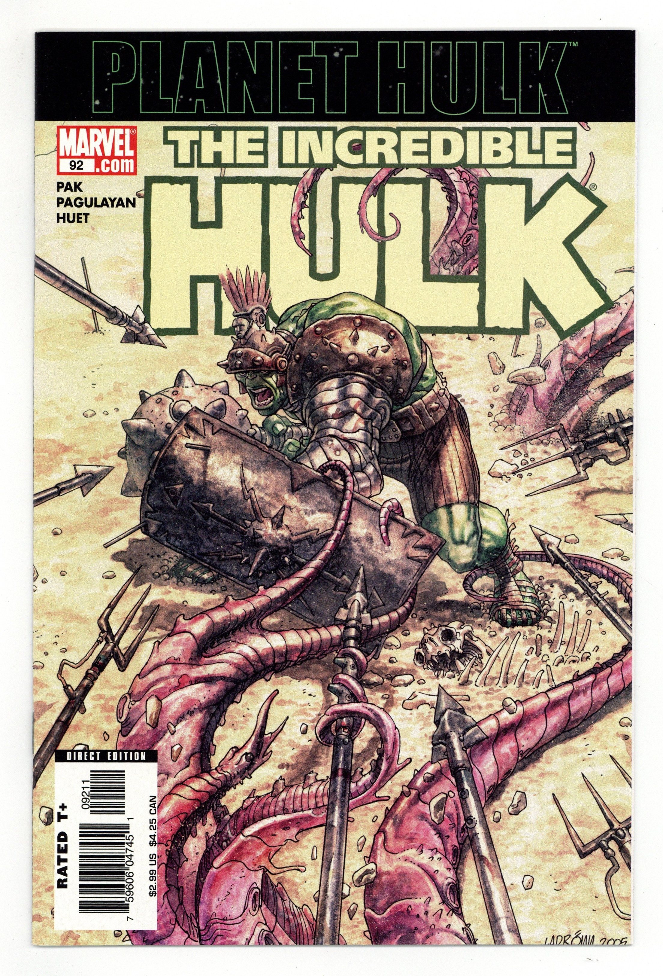 Planet Hulk: Exile 1/4 - Written by GREG PAK Penciled by CARLO PAGULAYAN. Cover by LADRÖNN. Savage alien planet. Oppressed barbarian tribes. Corrupt emperor. Deadly woman warrior. Gladiators and slaves. Battle axes and hand blasters. Monsters and heroes...And the Incredible Hulk! Let the smashing commence! PLANET HULK BEGINS!!! 36 pgs., T+ (suggested for teens and up) $2.99 Cover price $2.99.